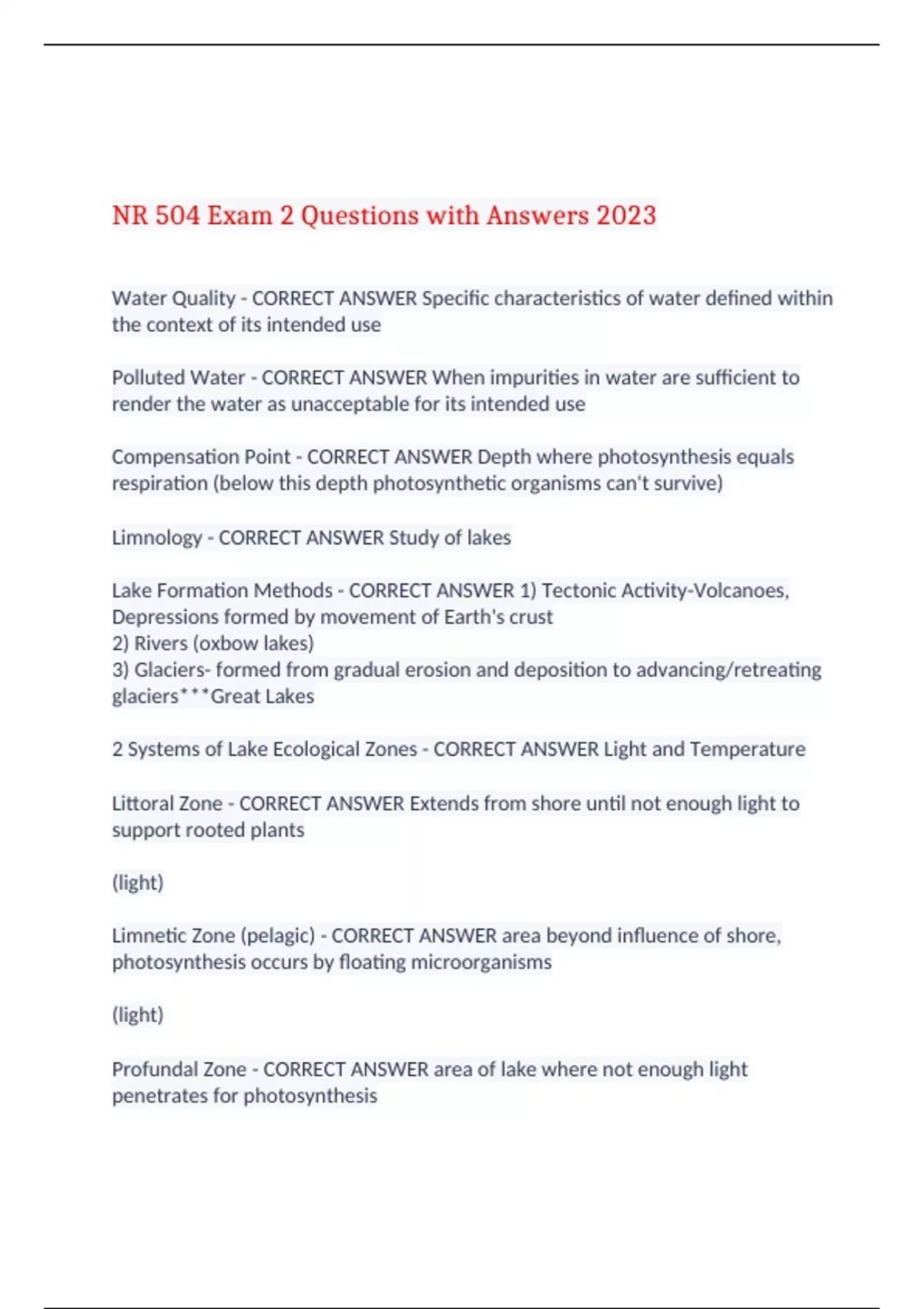 NR 504 Exam 2 Questions with Answers 2023 Water Quality - CORRECT ANSWER Specific characteristics of water defined within the context of its intended use Polluted Water - CORRECT ANSWER When impurities in water are sufficient to render the water as unacceptable for its intended use Compensation Point - CORRECT ANSWER Depth where photosynthesis equals respiration (below this depth photosynthetic organisms can't survive) Limnology - CORRECT ANSWER Study of lakes Lake Formation Methods - CORRECT ANSWER 1) Tectonic Activity-Volcanoes, Depressions formed by movement of Earth's crust 2) Rivers (oxbow lakes) 3) Glaciers- formed from gradual erosion and deposition to advancing/retreating glaciers***Great Lakes 2 Systems of Lake Ecological Zones - CORRECT ANSWER Light and Temperature Littoral Zone - CORRECT ANSWER Extends from shore until not enough light to support rooted plants (light) Limnetic Zone (pelagic) - CORRECT ANSWER area beyond influence of shore, photosynthesis occurs by floating microorganisms (light) Profundal Zone - CORRECT ANSWER area of lake where not enough light penetrates for photosynthesis (light) Lake Ecological Zone based on Temperature - CORRECT ANSWER Summer-Stratification (layers) due to temperature differences. Warm less dense water remains at surface--due to density, waters do not mix Fall-turnover of water occurs when density at surface increases, results in mixing of nutrients and dissolved oxygen Summer Stratification--Epilimnion - CORRECT ANSWER mixed layer top/surface water warm/less dense dissolved oxygen is high photosynthesis is dominant Summer Stratification--Metalimnion - CORRECT ANSWER Middle layer, steep thermal gradient (thermocline) Summer Stratification-- Hypolimnion - CORRECT ANSWER Deeper water, cold/dense Decomposition dominates low dissolved oxygen Great Lakes - CORRECT ANSWER HOMES Largest system of fresh surface water on earth (~18%) Vulnerable to pollution Outflows less than 1% of volume Wetlands - CORRECT ANSWER Areas of land inundated by water enough to affect soils (hydric) and plants (hydrophytes) Transitional land between terrestrial and aquatic ecosystems Water table is near or at the ground surface or land is covered by water Hydroperiod - CORRECT ANSWER Seasonal pattern of water level in a wetland Importance of Wetlands - CORRECT ANSWER -cleanse polluted water Prevention of floods Protection of shorelines Recharge of aquifers Wildlife habitat Maintain plant and animal diversity Carbon Storage Central and South Florida (C&SF) Project of 1948 - CORRECT ANSWER 1947- 108 inches of water fell on South Florida and ****d everything up Created 720 miles of levees, 1000 miles of canals, 16 pumping stations, 200 water control structures Positive Impacts: Reduce flooding, increased water supply, sugar cane production, water management for SF Negative Impacts: reduced Everglades by 50% Surface flows reduced by 70% Water quality, quantity, and timing modified, loss of habitat, deleterious effects on estuaries and citrus crop Everglades Restoration Project - CORRECT ANSWER Capture most diverted water and deliver to areas where needed. Used mostly for environmental restoration and some for farmers and urban areas. Restore quantity, quality, and timing of water flows Importance of Soil Water Movement - CORRECT ANSWER Irrigation Recharge zones for groundwater Soil as a filter Storage of wastes Flood Predictions Soil - CORRECT ANSWER Porous medium Consists of: Solid (sand, silt, clay, OM) Liquid(water) Gas(air, water vapor, CO2) Porosity - CORRECT ANSWER Amount of void space in a soil Volume of pores / Volume of soil (solid +pores) Soil Moisture Zone - CORRECT ANSWER Region of soil water available to Plants Intermediate Zone - CORRECT ANSWER Transition Zone (water content begins to increase) Capillary Fringe - CORRECT ANSWER Pores are filled with water but water is held by capillary forces Saturated Zone(groundwater zone) - CORRECT ANSWER Pores are filled with water and water moves due to gravity Soil Moisture Properties - CORRECT ANSWER Saturated - all pores are filled with water Volumetric moisture content =porosity Unsaturated= pores contain air and water. Volumetric moisture content < porosity Volumetric Moisture Content - CORRECT ANSWER Volume of water / Volume of soil (cm3/cm3) Equal to porosity when soil is FULLY saturated Field Capacity - CORRECT ANSWER Amount of water held against gravity Water in soil after saturating then draining Permanent Wilting Point - CORRECT ANSWER Soil moisture content at which water is no longer available to plants Available Water (Soil) - CORRECT ANSWER Difference between field capacity and wiling point Forces driving Water movement through soil - CORRECT ANSWER Gravity (pulls water to center of Earth) Capillarity (Rise of water in small tubes against force of gravity) Osmotic Tensions (plant uptake of water) Infiltration - CORRECT ANSWER Movement of rain and melting snow into the soil Rate: Rate at which water enters the soil Capacity: Maximum infiltration rate Infiltration Capacity - CORRECT ANSWER Max. infiltration rate Initially very high in dry soils Decreases as soil gets more wet When reduced below rainfall rate water will accumulate on surface leading to runoff P-Rate > I-Rate Factors Affecting Infiltration Rates - CORRECT ANSWER -Physical Factors of soils (soil permeability, macropores) -Biological (organic content, presence of roots, vegetation presence/type, animal burrows) -Meteorological (storm intensity, antecedent moisture conditions, temperature-water viscosity increases as temp. falls) -Anthropogenic (urbanization, vegetation removal, agricultural methods) Infiltration in Forests - CORRECT ANSWER Very high due to organic matter Rarely does precipitation exceed infiltration Infiltration in Agriculture - CORRECT ANSWER Variable- depends on tilling practices, crop type, grazing Infiltration in Urban - CORRECT ANSWER Low due to impervious cover, promotes flash flooding Groundwater - CORRECT ANSWER Water bel