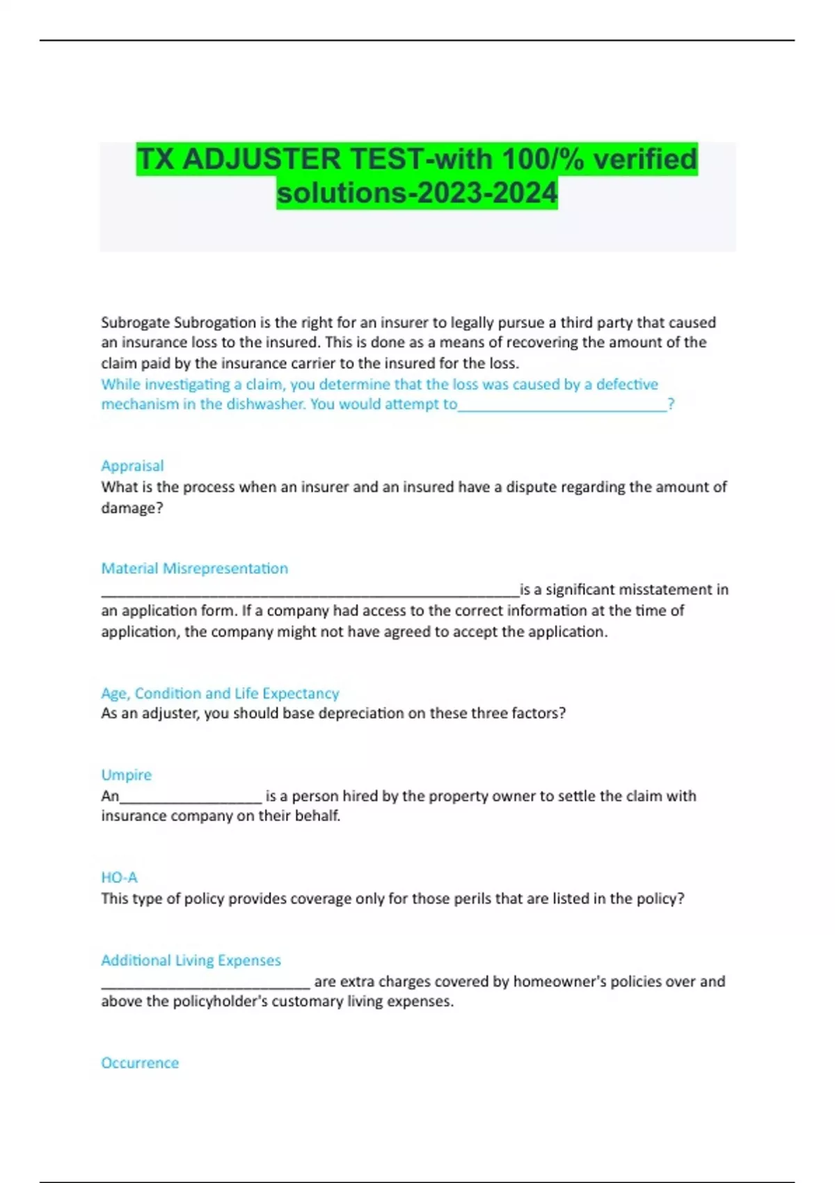 TX ADJUSTER TEST-with 100/% verified solutions-