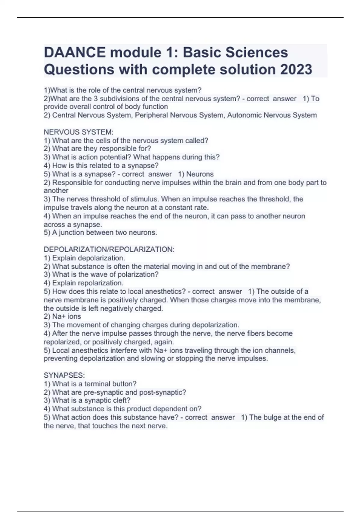DAANCE module 1: Basic Sciences Questions with complete solution 20231)What is the role of the central nervous system? 2)What are the 3 subdivisions of the central nervous system? 1) To provide overall control of body function 2) Central Nervous System, Peripheral Nervous System, Autonomic Nervous System NERVOUS SYSTEM: 1) What are the cells of the nervous system called? 2) What are they responsible for? 3) What is action potential? What happens during this? 4) How is this related to a synapse? 5) What is a synapse? 1) Neurons 2) Responsible for conducting nerve impulses within the brain and from one body part to another 3) The nerves threshold of stimulus. When an impulse reaches the threshold, the impulse travels along the neuron at a constant rate. 4) When an impulse reaches the end of the neuron, it can pass to another neuron across a synapse. 5) A junction between two neurons. DEPOLARIZATION/REPOLARIZATION: 1) Explain depolarization. 2) What substance is often the material moving in and out of the membrane? 3) What is the wave of polarization? 4) Explain repolarization. 5) How does this relate to local anesthetics? 1) The outside of a nerve membrane is positively charged. When those charges move into the membrane, the outside is left negatively charged. 2) Na+ ions 3) The movement of changing charges during depolarization. 4) After the nerve impulse passes through the nerve, the nerve fibers become repolarized, or positively charged, again. 5) Local anesthetics interfere with Na+ ions traveling through the ion channels, preventing depolarization and slowing or stopping the nerve impulses. SYNAPSES: 1) What is a terminal button? 2) What are pre-synaptic and post-synaptic? 3) What is a synaptic cleft? 4) What substance is this product dependent on? 5) What action does this substance have? 1) The bulge at the end of the nerve, that touches the next nerve. 2) The nerve before and after the synapse that is active. 3) The gap between two nerves, which a nerve impulse must 'jump across' to communicate with the next nerve. 4) Neurotransmitters 5) They enable transmission of the depolarization wave from one nerve onto the receptor sites of the next. CENTRAL NERVOUS SYSTEM: 1) What is the central nervous system, and what does it consist of? 2) What are the parts of the CNS? (4 parts) 1) It is the overall control center of the body, consists of the brain and the spinal cord. 2) Cerebral Cortex, Core of the Brain, Cerebellum, and