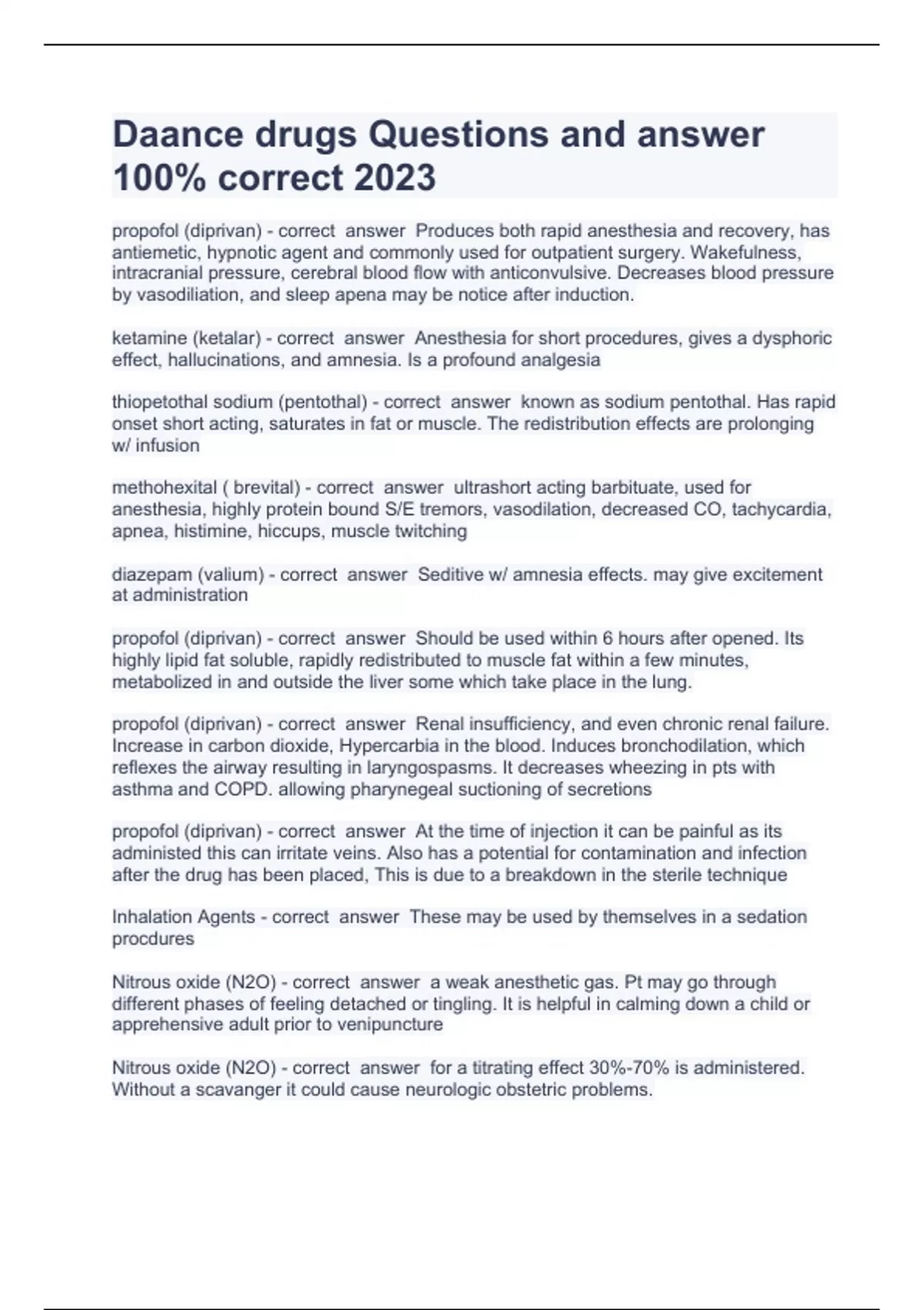 Daance drugs Questions and answer 100% correct 2023propofol (diprivan) Produces both rapid anesthesia and recovery, has antiemetic, hypnotic agent and commonly used for outpatient surgery. Wakefulness, intracranial pressure, cerebral blood flow with anticonvulsive. Decreases blood pressure by vasodiliation, and sleep apena may be notice after induction. ketamine (ketalar) Anesthesia for short procedures, gives a dysphoric effect, hallucinations, and amnesia. Is a profound analgesia thiopetothal sodium (pentothal) known as sodium pentothal. Has rapid onset short acting, saturates in fat or muscle. The redistribution effects are prolonging w/ infusion methohexital ( brevital) ultrashort acting barbituate, used for anesthesia, highly protein bound S/E tremors, vasodilation, decreased CO, tachycardia, apnea, histimine, hiccups, muscle twitching diazepam (valium) Seditive w/ amnesia effects. may give excitement at administration