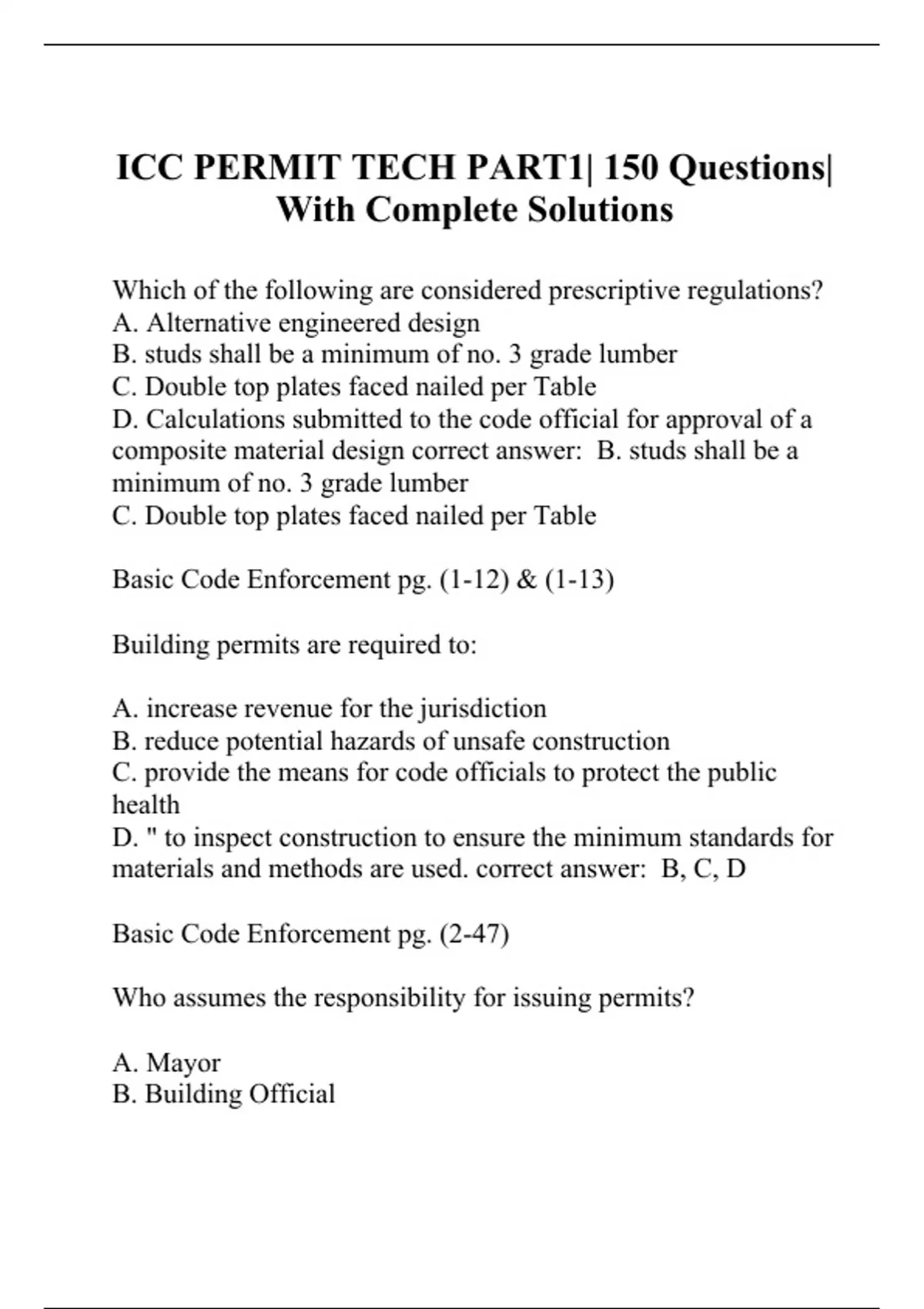 Which of the following are considered prescriptive regulations? A. Alternative engineered design B. studs shall be a minimum of no. 3 grade lumber C. Double top plates faced nailed per Table D. Calculations submitted to the code official for approval of a composite material design correct answer: B. studs shall be a minimum of no. 3 grade lumber C. Double top plates faced nailed per Table Basic Code Enforcement pg. (1-12) & (1-13) Building permits are required to: A. increase revenue for the jurisdiction B. reduce potential hazards of unsafe construction C. provide the means for code officials to protect the public health D. " to inspect construction to ensure the minimum standards for materials and methods are used. correct answer: B, C, D Basic Code Enforcement pg. (2-47) Who assumes the responsibility for issuing permits? A. Mayor B. Building Official C. Permit Technician