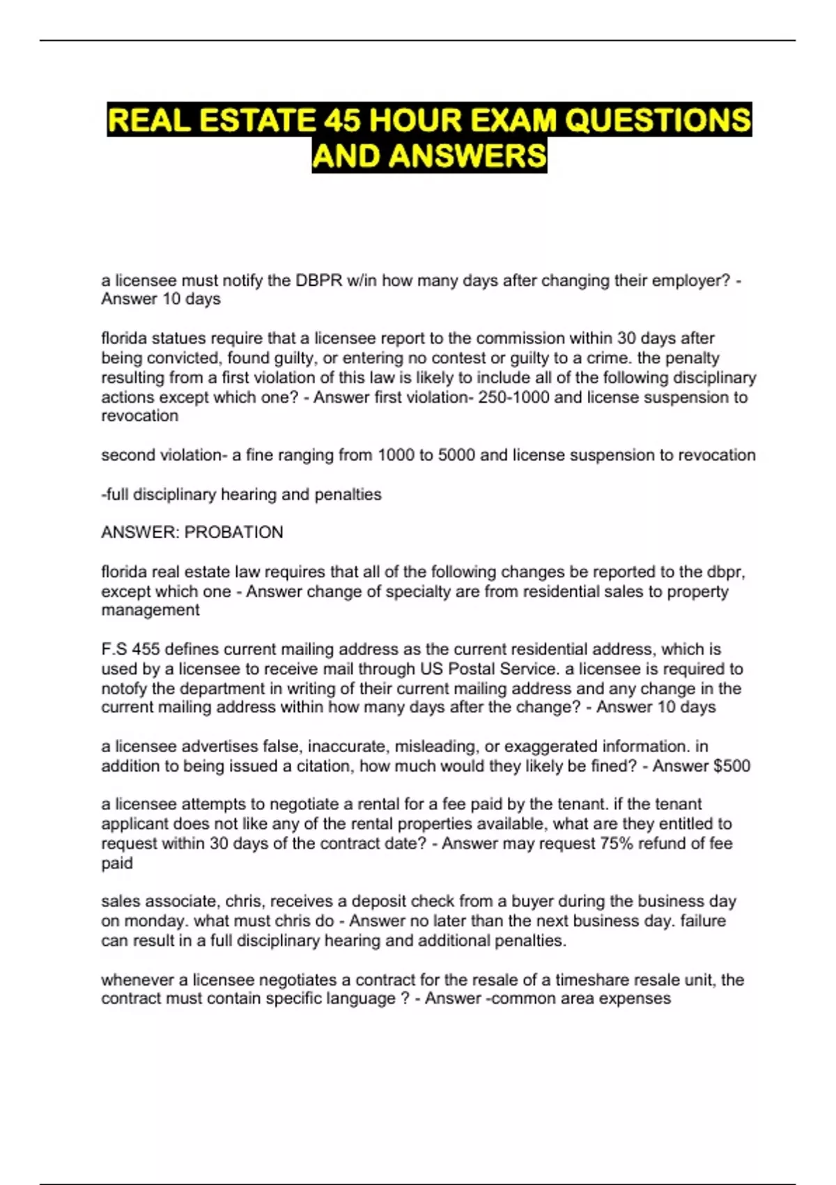 REAL ESTATE 45 HOUR EXAM QUESTIONS AND ANSWERS...