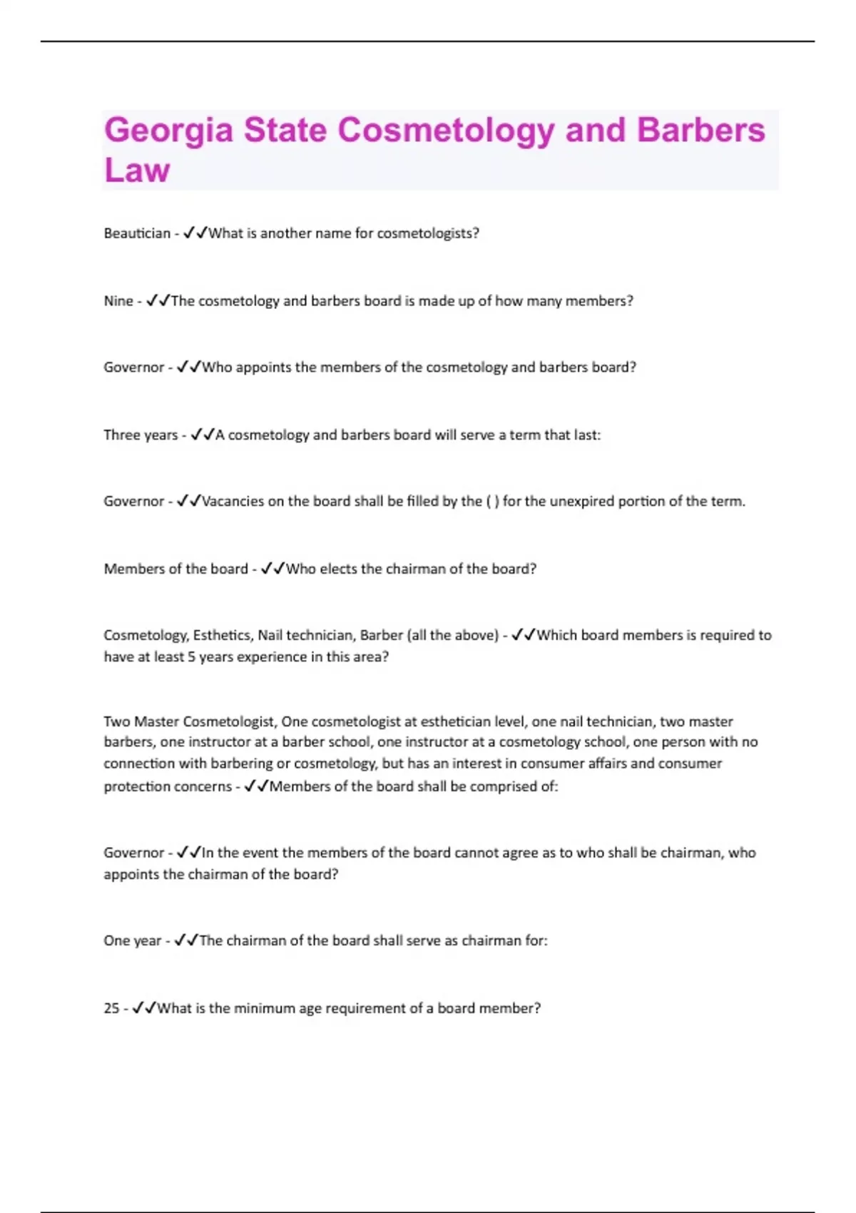 Georgia State Cosmetology and Barbers Law | 46 Questions and Answers (A +solution guided)