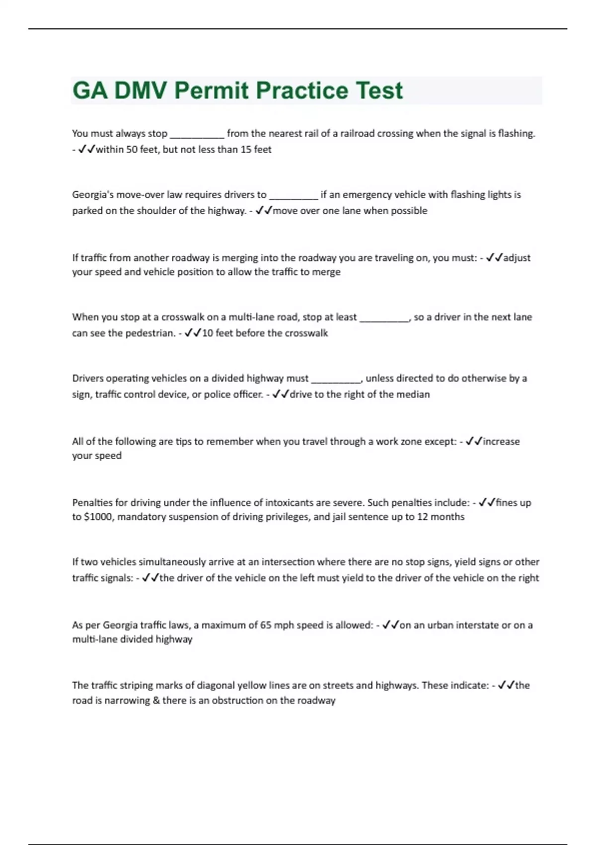 You must always stop __________ from the nearest rail of a railroad crossing when the signal is flashing. - within 50 feet, but not less than 15 feet Georgia's move-over law requires drivers to _________ if an emergency vehicle with flashing lights is parked on the shoulder of the highway. - move over one lane when possible If traffic from another roadway is merging into the roadway you are traveling on, you must: - adjust your speed and vehicle position to allow the traffic to merge When you stop at a crosswalk on a multi-lane road, stop at least _________, so a driver in the next lane can see the pedestrian. - 10 feet before the crosswalk Drivers operating vehicles on a divided highway must _________, unless directed to do otherwise by a sign, traffic control device, or police officer. - drive to the right of the median All of the following are tips to remember when you travel through a work zone except: - increase your speed Penalties for driving under the influence of intoxicants are severe. Such penalties include: - fines up to $1000, mandatory suspension of driving privileges, and jail sentence up to 12 months If two vehicles simultaneously arrive at an intersection where there are no stop signs, yield signs or other traffic signals: - the driver of the vehicle on the left must yield to the driver of the vehicle on the right As per Georgia traffic laws, a maximum of 65 mph speed is allowed: - on an urban interstate or on a multi-lane divided highway The traffic striping marks of diagonal yellow lines are on streets and highways. These indicate: - the road is narrowing & there is an obstruction on the roadway