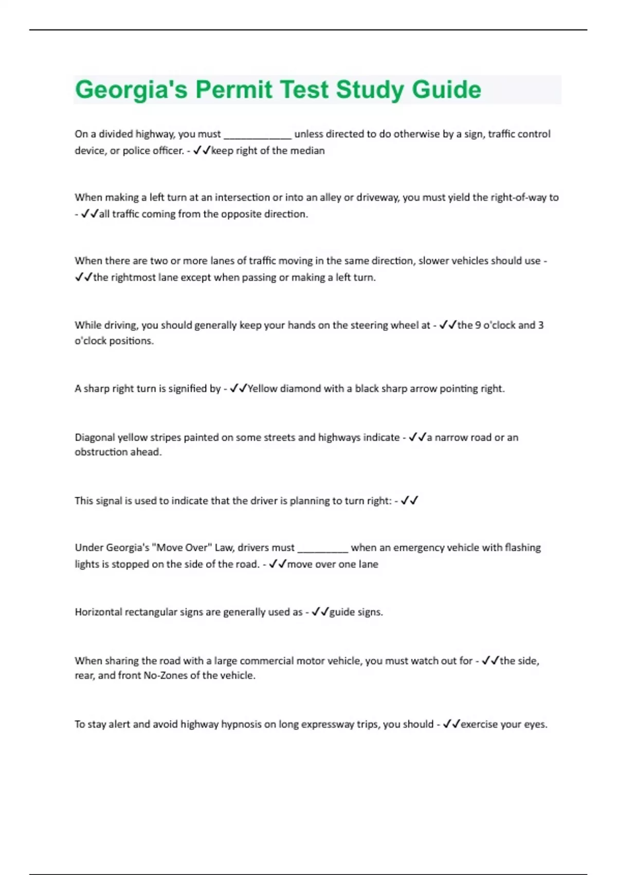 On a divided highway, you must ____________ unless directed to do otherwise by a sign, traffic control device, or police officer. - keep right of the median When making a left turn at an intersection or into an alley or driveway, you must yield the right-of-way to - all traffic coming from the opposite direction. When there are two or more lanes of traffic moving in the same direction, slower vehicles should use - the rightmost lane except when passing or making a left turn. While driving, you should generally keep your hands on the steering wheel at - the 9 o'clock and 3 o'clock positions. A sharp right turn is signified by - Yellow diamond with a black sharp arrow pointing right. Diagonal yellow stripes painted on some streets and highways indicate - a narrow road or an obstruction ahead. This signal is used to indicate that the driver is planning to turn right: - Under Georgia's "Move Over" Law, drivers must _________ when an emergency vehicle with flashing lights is stopped on the side of the road. - move over one lane Horizontal rectangular signs are generally used as - guide signs. When sharing the road with a large commercial motor vehicle, you must watch out for - the side, rear, and front No-Zones of the vehicle. To stay alert and avoid highway hypnosis on long expressway trips, you should - exercise your eyes.