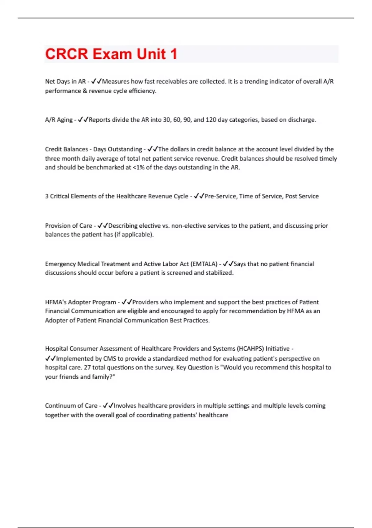 Net Days in AR - Measures how fast receivables are collected. It is a trending indicator of overall A/R performance & revenue cycle efficiency. A/R Aging - Reports divide the AR into 30, 60, 90, and 120 day categories, based on discharge. Credit Balances - Days Outstanding - The dollars in credit balance at the account level divided by the three month daily average of total net patient service revenue. Credit balances should be resolved timely and should be benchmarked at 1% of the days outstanding in the AR. 3 Critical Elements of the Healthcare Revenue Cycle - Pre-Service, Time of Service, Post Service Provision of Care - Describing elective vs. non-elective services to the patient, and discussing prior balances the patient has (if applicable). Emergency Medical Treatment and Active Labor Act (EMTALA) - Says that no patient financial discussions should occur before a patient is screened and stabilized. HFMA's Adopter Program - Providers who implement and support the best practices of Patient Financial Communication are eligible and encouraged to apply for recommendation by HFMA as an Adopter of Patient Financial Communication Best Practices. Hospital Consumer Assessment of Healthcare Providers and Systems (HCAHPS) Initiative - Implemented by CMS to provide a standardized method for evaluating patient's perspective on hospital care. 27 total questions on the survey. Key Question is "Would you recommend this hospital to your friends and family?" Continuum of Care - Involves healthcare providers in multiple settings and multiple levels coming together with the overall goal of coordinating patients' healthcare