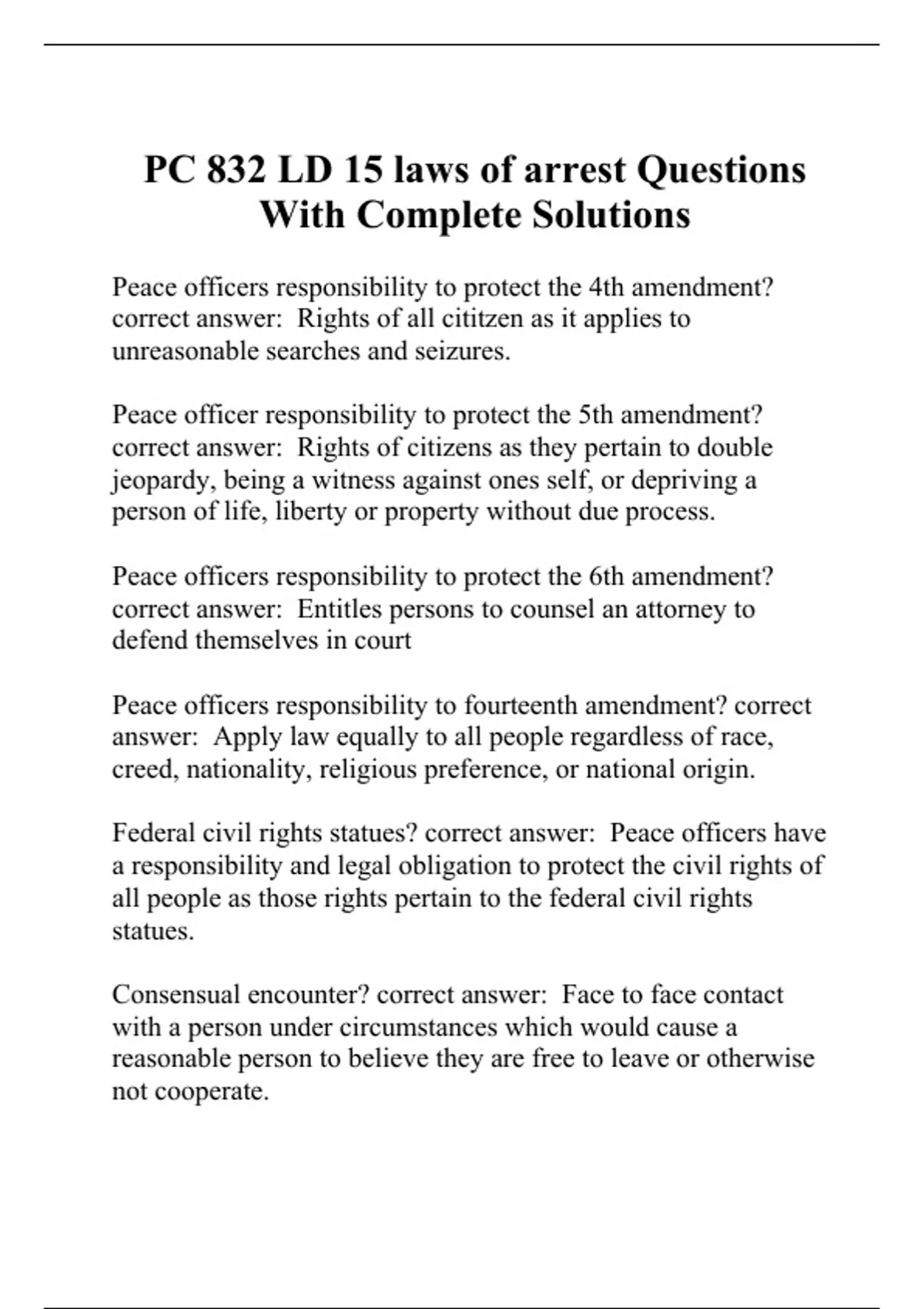 Peace officers responsibility to protect the 4th amendment? correct answer: Rights of all cititzen as it applies to unreasonable searches and seizures. Peace officer responsibility to protect the 5th amendment? correct answer: Rights of citizens as they pertain to double jeopardy, being a witness against ones self, or depriving a person of life, liberty or property without due process. Peace officers responsibility to protect the 6th amendment? correct answer: Entitles persons to counsel an attorney to defend themselves in court Peace officers responsibility to fourteenth amendment? correct answer: Apply law equally to all people regardless of race, creed, nationality, religious preference, or national origin. Federal civil rights statues? correct answer: Peace officers have a responsibility and legal obligation to protect the civil rights of all people as those rights pertain to the federal civil rights statues. Consensual encounter? correct answer: Face to face contact with a person under circumstances which would cause a reasonable person to believe they are free to leave or otherwise not cooperate.