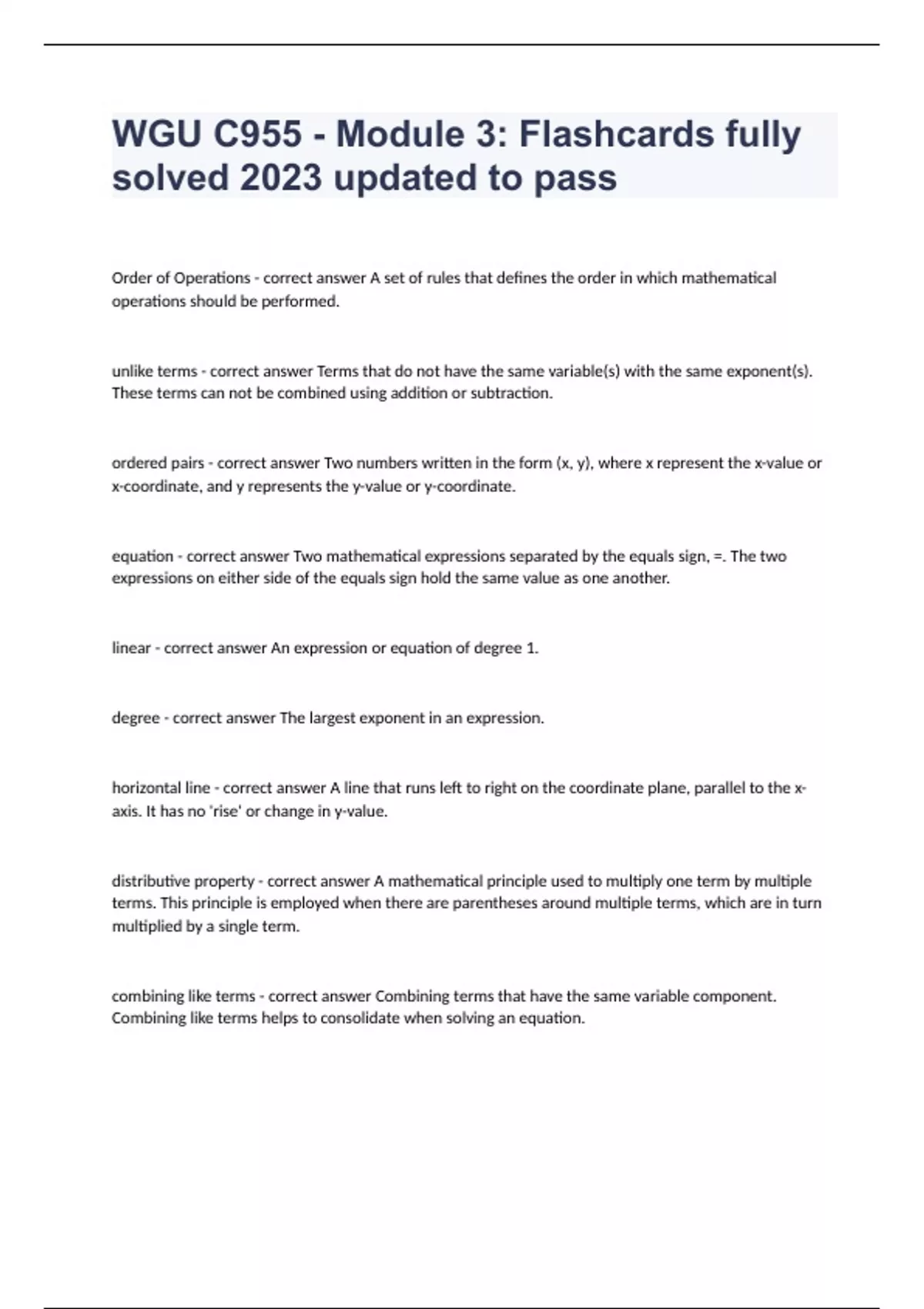 WGU C955 - Module 3: Flashcards fully solved 2023 updated to passOrder of Operations - correct answer A set of rules that defines the order in which mathematical operations should be performed. unlike terms - correct answer Terms that do not have the same variable(s) with the same exponent(s). These terms can not be combined using addition or subtraction. ordered pairs - correct answer Two numbers written in the form (x, y), where x represent the x-value or x-coordinate, and y represents the y-value or y-coordinate. equation - correct answer Two mathematical expressions separated by the equals sign, =. The two expressions on either side of the equals sign hold the same value as one another. linear - correct answer An expression or equation of degree 1. degree - correct answer The largest exponent in an expression. horizontal line - correct answer A line that runs left to right on the coordinate plane, parallel to the x-axis. It has no 'rise' or change in y-value. distributive property - correct answer A mathematical principle used to multiply one term by multiple terms. This principle is employed when there are parentheses around multiple terms, which are in turn multiplied by a single term. combining like terms - correct answer Combining terms that have the same variable component. Combining like terms helps to consolidate when solving an equation.