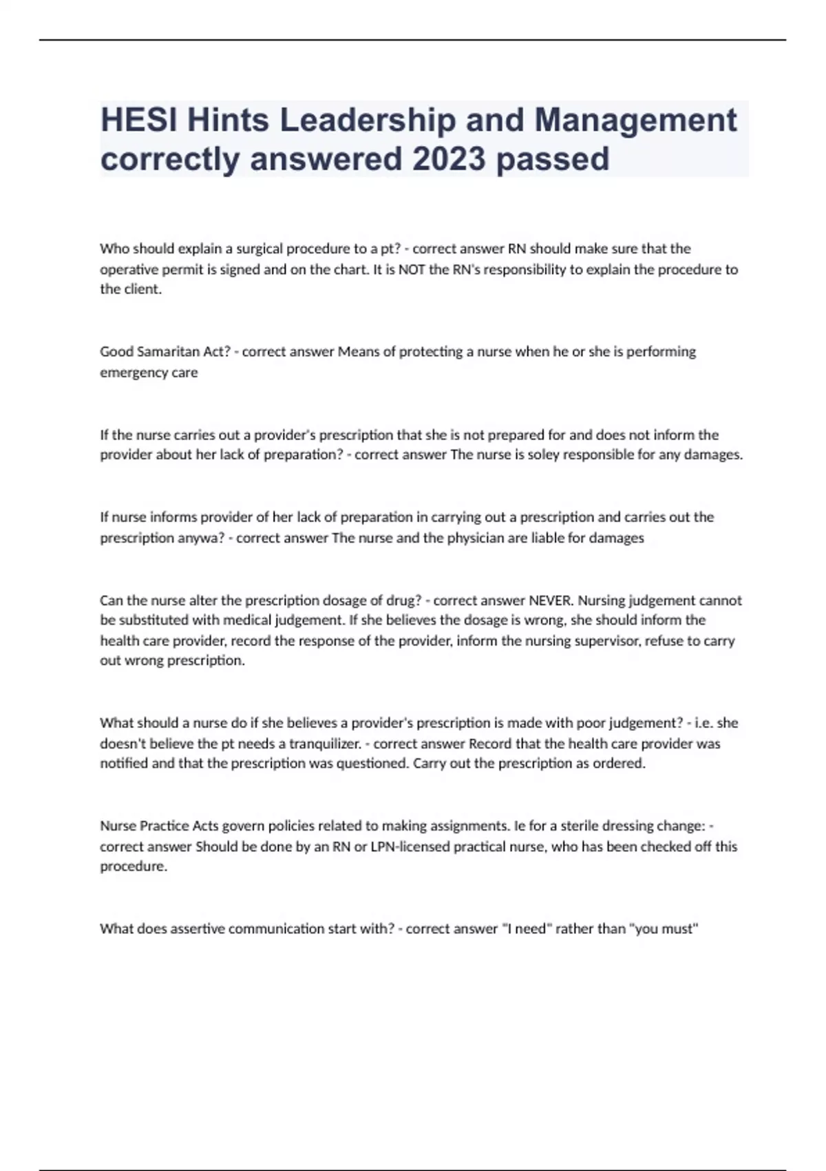 HESI Hints Leadership and Management correctly answered 2023 passedWho should explain a surgical procedure to a pt? - correct answer RN should make sure that the operative permit is signed and on the chart. It is NOT the RN's responsibility to explain the procedure to the client. Good Samaritan Act? - correct answer Means of protecting a nurse when he or she is performing emergency care If the nurse carries out a provider's prescription that she is not prepared for and does not inform the provider about her lack of preparation? - correct answer The nurse is soley responsible for any damages. If nurse informs provider of her lack of preparation in carrying out a prescription and carries out the prescription anywa? - correct answer The nurse and the physician are liable for damages Can the nurse alter the prescription dosage of drug? - correct answer NEVER. Nursing judgement cannot be substituted with medical judgement. If she believes the dosage is wrong, she should inform the health care provider, record the response of the provider, inform the nursing supervisor, refuse to carry out wrong prescription. What should a nurse do if she believes a provider's prescription is made with poor judgement? - i.e. she doesn't believe the pt needs a tranquilizer. - correct answer Record that the health care provider was notified and that the prescription was questioned. Carry out the prescription as ordered. Nurse Practice Acts govern policies related to making assignments. Ie for a sterile dressing change: - correct answer Should be done by an RN or LPN-licensed practical nurse, who has been checked off this procedure. What does assertive communication start with? - correct answer "I need" rather than "you must" Motivation comes from within an individual. What can a nurse leader provide? - correct answer Nurse leader can provide an environment that will promote motivation through
