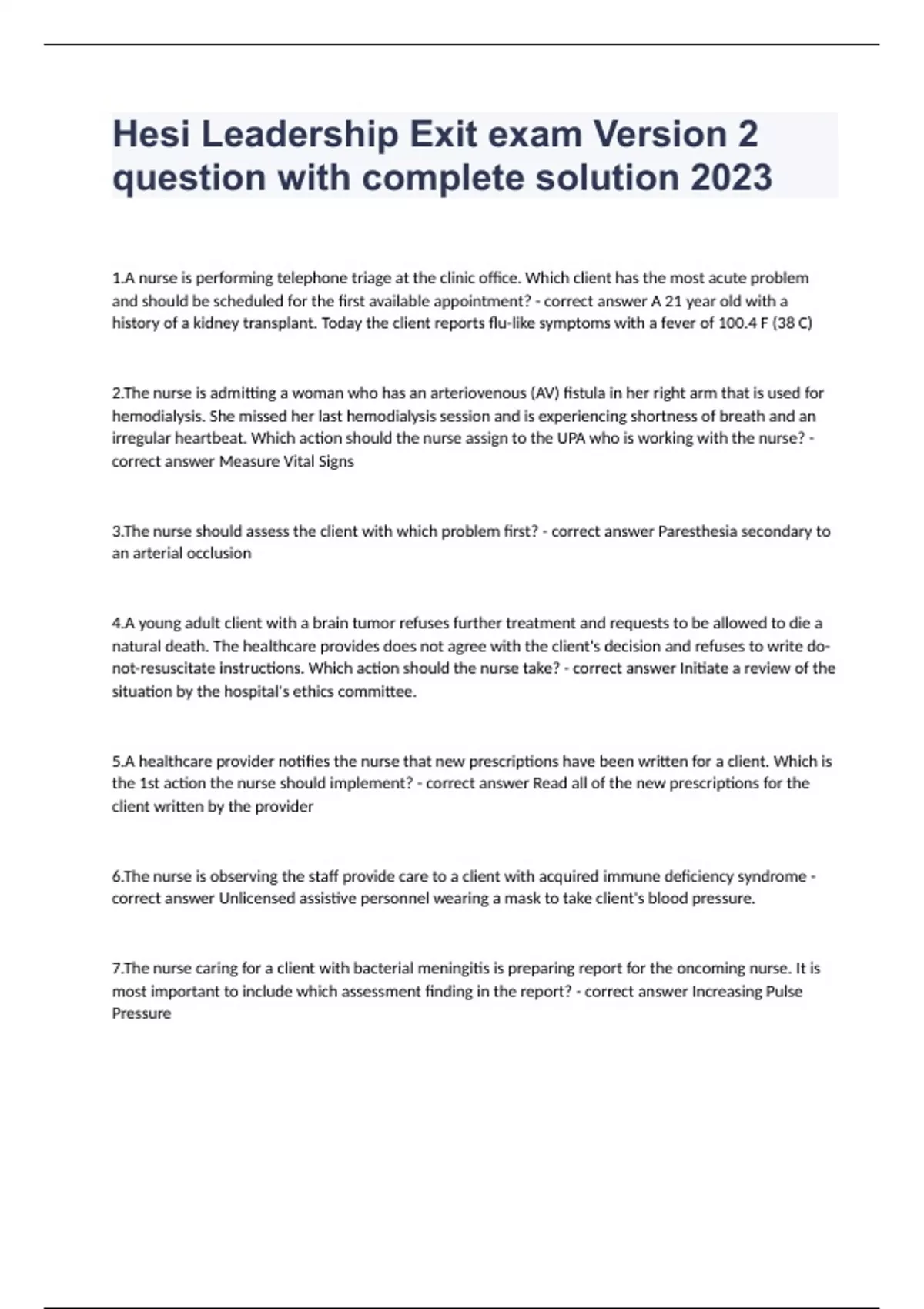 Hesi Leadership Exit exam Version 2 question with complete solution 20231.A nurse is performing telephone triage at the clinic office. Which client has the most acute problem and should be scheduled for the first available appointment? - correct answer A 21 year old with a history of a kidney transplant. Today the client reports flu-like symptoms with a fever of 100.4 F (38 C) 2.The nurse is admitting a woman who has an arteriovenous (AV) fistula in her right arm that is used for hemodialysis. She missed her last hemodialysis session and is experiencing shortness of breath and an irregular heartbeat. Which action should the nurse assign to the UPA who is working with the nurse? - correct answer Measure Vital Signs 3.The nurse should assess the client with which problem first? - correct answer Paresthesia secondary to an arterial occlusion 4.A young adult client with a brain tumor refuses further treatment and requests to be allowed to die a natural death. The healthcare provides does not agree with the client's decision and refuses to write do-not-resuscitate instructions. Which action should the nurse take? - correct answer Initiate a review of the situation by the hospital's ethics committee. 5.A healthcare provider notifies the nurse that new prescriptions have been written for a client. Which is the 1st action the nurse should implement? - correct answer Read all of the new prescriptions for the client written by the provider 6.The nurse is observing the staff provide care to a client with acquired immune deficiency syndrome - correct answer Unlicensed assistive personnel wearing a mask to take client's blood pressure. 7.The nurse caring for a client with bacterial meningitis is preparing report for the oncoming nurse. It is most important to include which assessment finding in the report? - correct answer Increasing Pulse Pressure 8.The charge nurse notices that a respiratory therapist who has been cross-trained to work as a phlebotomist and unlicensed assistive personnel (UAP) seems to be avoiding HIV positive clients - correct answer Provide the employee with feedback about observed behavior 9.The nursing supervisor sends an unlicensed assistant personnel ( UAP) to a medical unit to replace an absent UAP. When delegating the task of obtaining client's blood sugar levels using a glucometer, which action is most important for the nurse to implement? - correct answer Observe the UAP obtain a fingerstick glucose level using the glucometer. 10.The nurse manager conducts regular audits of patient care medication records and notices that the amount of narcotic pain medications administered during the evening shift on a postsurgical unit - correct answer Conduct a closer examination of staff nurse's distribution of pain medication from evening shift 11.The smell of cigarette smoke is coming from a client's bathroom. Which action should the nurse - correct answer Educate the client about the hospital smoking policy. 12.The practical nurse (PN) reports to the charge nurse that the transparent dressing covering a single lumen central venous catheter inserted in the subclavian vein of a client has come loose and the insertion site is inflamed. Which action should the charge nurse implement? - correct answer Confirm the findings of the PN while securing the transparent dressing and notify the healthcare provider. 13.At 0200 the nurse phones the healthcare provider to request a PRN medication for a client who is unable to sleep. The healthcare provider is awakened and gives the nurse a prescription for four times the normal dosage. When questioned by the nurse, the healthcare provider responds in a sleepy - correct answer Call the healthcare or back, and report that the dosage prescribed is our times the normal dosage. 14.The charge nurse notices that a female practical nurse (PN), who has a long work history on the unit and is a valued employee, seems tired and slow to respond verbally during the change of shift report. One hour later the charge nurse overhears the PN telling an unlicensed assistive personnel (UAP) that she took a sleeping pill 4 hours ago and she is still feeling its effects. Which action should the charge nurse take? - correct answer Send the PN to the employee health center for a urine drug Screen