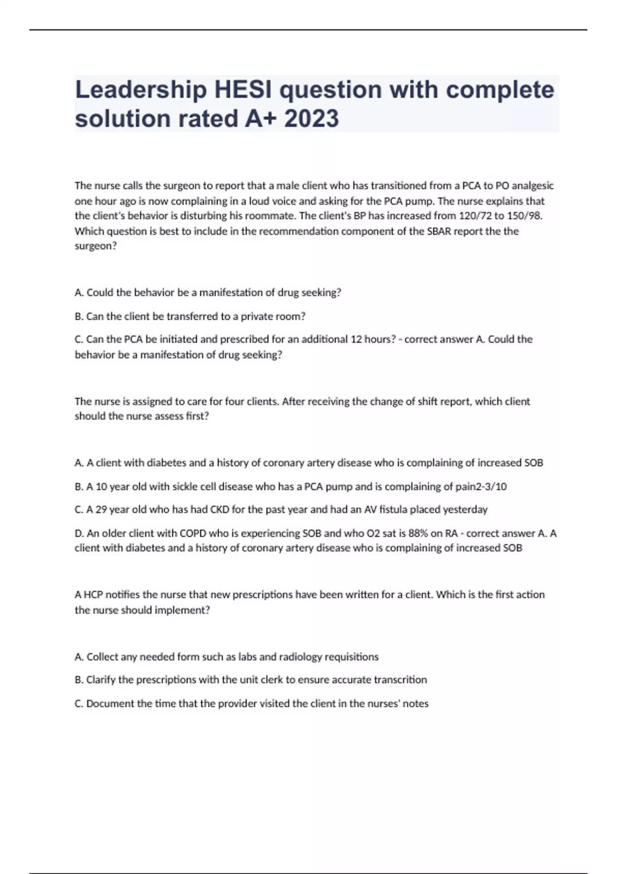 Leadership HESI question with complete solution rated A+ 2023The nurse calls the surgeon to report that a male client who has transitioned from a PCA to PO analgesic one hour ago is now complaining in a loud voice and asking for the PCA pump. The nurse explains that the client's behavior is disturbing his roommate. The client's BP has increased from 120/72 to 150/98. Which question is best to include in the recommendation component of the SBAR report the the surgeon? A. Could the behavior be a manifestation of drug seeking? B. Can the client be transferred to a private room? C. Can the PCA be initiated and prescribed for an additional 12 hours? - correct answer A. Could the behavior be a manifestation of drug seeking? The nurse is assigned to care for four clients. After receiving the change of shift report, which client should the nurse assess first? A. A client with diabetes and a history of coronary artery disease who is complaining of increased SOB B. A 10 year old with sickle cell disease who has a PCA pump and is complaining of pain2-3/10 C. A 29 year old who has had CKD for the past year and had an AV fistula placed yesterday D. An older client with COPD who is experiencing SOB and who O2 sat is 88% on RA - correct answer A. A client with diabetes and a history of coronary artery disease who is complaining of increased SOB A HCP notifies the nurse that new prescriptions have been written for a client. Which is the first action the nurse should implement? A. Collect any needed form such as labs and radiology requisitions B. Clarify the prescriptions with the unit clerk to ensure accurate transcrition C. Document the time that the provider visited the client in the nurses' notes D. Read all of the new prescriptions for the client written by the provider - correct answer D. Read all of the new prescriptions for the client written by the provider A RN, PN and UAP are working as team to provide care for a acutely ill client requiring immediate bedside insertion of a chest tube. Which assignment is the best use of each person's skills? A. RN inserts chest tub immediately after PN cleans the skin at insertion site B. The UAP listed to breath sounds while the RN witnesses the informed consent C. The PN instructs the family about he need for chest tube insertion while the RN obtains VS D. The UAP obtains an O2 sat level while the RN reports the findings to the HCP - correct answer D. The UAP obtains an O2 sat level while the RN reports the findings to the HCP