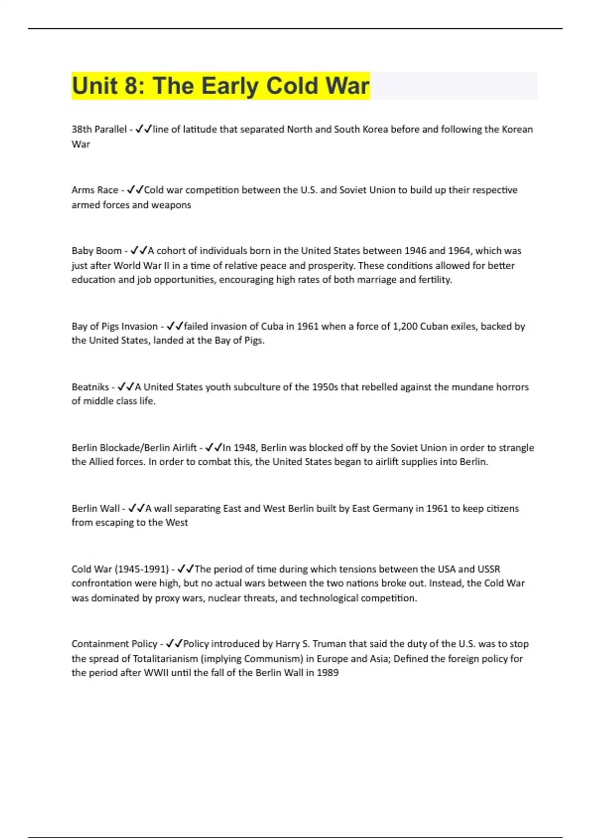 38th Parallel - line of latitude that separated North and South Korea before and following the Korean War Arms Race - Cold war competition between the U.S. and Soviet Union to build up their respective armed forces and weapons Baby Boom - A cohort of individuals born in the United States between 1946 and 1964, which was just after World War II in a time of relative peace and prosperity. These conditions allowed for better education and job opportunities, encouraging high rates of both marriage and fertility. Bay of Pigs Invasion - failed invasion of Cuba in 1961 when a force of 1,200 Cuban exiles, backed by the United States, landed at the Bay of Pigs. Beatniks - A United States youth subculture of the 1950s that rebelled against the mundane horrors of middle class life. Berlin Blockade/Berlin Airlift - In 1948, Berlin was blocked off by the Soviet Union in order to strangle the Allied forces. In order to combat this, the United States began to airlift supplies into Berlin. Berlin Wall - A wall separating East and West Berlin built by East Germany in 1961 to keep citizens from escaping to the West Cold War () - The period of time during which tensions between the USA and USSR confrontation were high, but no actual wars between the two nations broke out. Instead, the Cold War was dominated by proxy wars, nuclear threats, and technological competition. Containment Policy - Policy introduced by Harry S. Truman that said the duty of the U.S. was to stop the spread of Totalitarianism (implying Communism) in Europe and Asia; Defined the foreign policy for the period after WWII until the fall of the Berlin Wall in 1989