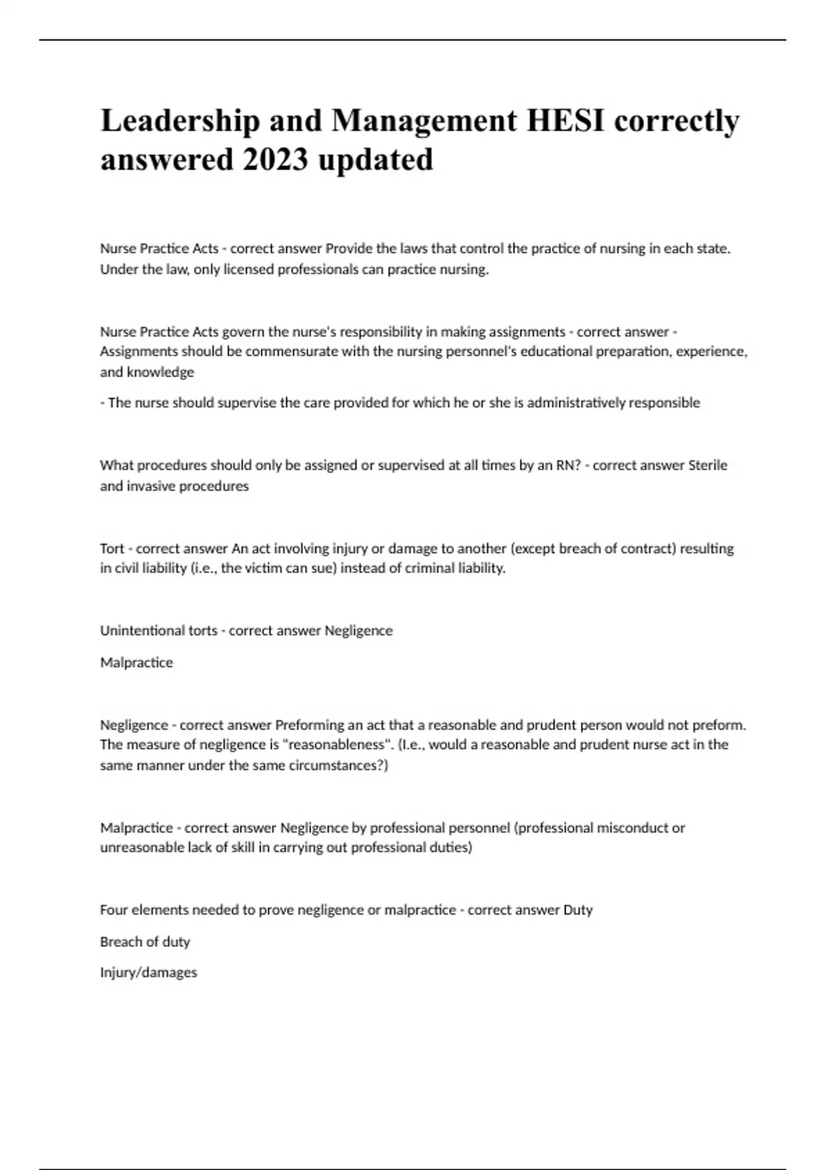 Leadership and Management HESI correctly answered 2023 updatedNurse Practice Acts - correct answer Provide the laws that control the practice of nursing in each state. Under the law, only licensed professionals can practice nursing. Nurse Practice Acts govern the nurse's responsibility in making assignments - correct answer -Assignments should be commensurate with the nursing personnel's educational preparation, experience, and knowledge - The nurse should supervise the care provided for which he or she is administratively responsible What procedures should only be assigned or supervised at all times by an RN? - correct answer Sterile and invasive procedures Tort - correct answer An act involving injury or damage to another (except breach of contract) resulting in civil liability (i.e., the victim can sue) instead of criminal liability. Unintentional torts - correct answer Negligence Malpractice Negligence - correct answer Preforming an act that a reasonable and prudent person would not preform. The measure of negligence is "reasonableness". (I.e., would a reasonable and prudent nurse act in the same manner under the same circumstances?) Malpractice - correct answer Negligence by professional personnel (professional misconduct or unreasonable lack of skill in carrying out professional duties) Four elements needed to prove negligence or malpractice - correct answer Duty Breach of duty Injury/damages