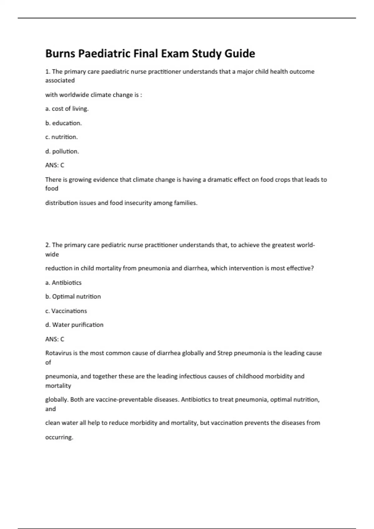 1. The primary care paediatric nurse practitioner understands that a major child health outcome associated with worldwide climate change is : a. cost of living. b. education. c. nutrition. d. pollution. ANS: C There is growing evidence that climate change is having a dramatic effect on food crops that leads to food distribution issues and food insecurity among families. 2. The primary care pediatric nurse practitioner understands that, to achieve the greatest worldwide reduction in child mortality from pneumonia and diarrhea, which intervention is most effective? a. Antibiotics b. Optimal nutrition c. Vaccinations d. Water purification ANS: C