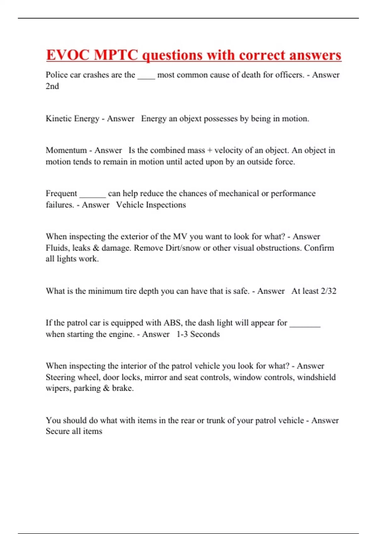 Police car crashes are the ____ most common cause of death for officers. - Answer 2nd Kinetic Energy - Answer Energy an objext possesses by being in motion. Momentum - Answer Is the combined mass + velocity of an object. An object in motion tends to remain in motion until acted upon by an outside force. Frequent ______ can help reduce the chances of mechanical or performance failures. - Answer Vehicle Inspections When inspecting the exterior of the MV you want to look for what? - Answer Fluids, leaks & damage. Remove Dirt/snow or other visual obstructions. Confirm all lights work. What is the minimum tire depth you can have that is safe. - Answer At least 2/32 If the patrol car is equipped with ABS, the dash light will appear for _______ when starting the engine. - Answer 1-3 Seconds When inspecting the interior of the patrol vehicle you look for what? - Answer Steering wheel, door locks, mirror and seat controls, window controls, windshield wipers, parking & brake. You should do what with items in the rear or trunk of your patrol vehicle - Answer Secure all items Longitudinal weight transfers occurs when vehicles are