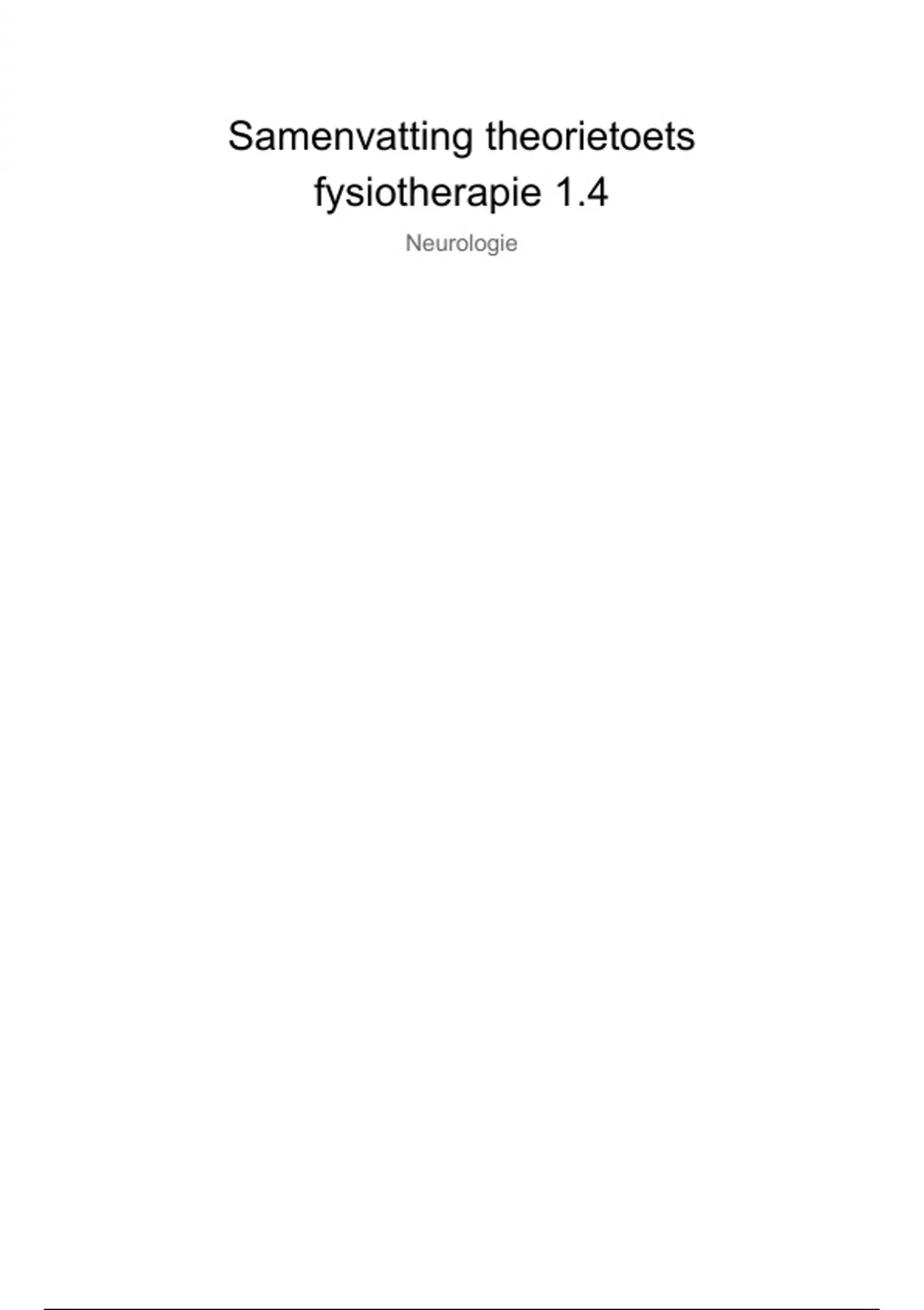 Samenvatting voor de theorietoets fysiotherapie van blok 1.4 (neurorevalidatie). De medisch biologische en FT-zorg hoorcolleges zijn samengevat, met als aanvulling ook de studievragen. Dit blok gaat over zenuwen. De anatomie van de zenuwen staat er ook in uitgewerkt. Perifere zenuwen, plexus brachialis laesies (Erb's palsy, Klumkes paralyse, thoracic outlet syndrome), centrale aandoeningen, radiculair syndroom (cerviaal, lumbaal, lumbosacraal), hernia (HNP), polyneuropathie (axonale, critical illness, Guillain barré syndroom (GBS)), dwarslaesie (totale en partiële) en motor neuron disease/ALS.