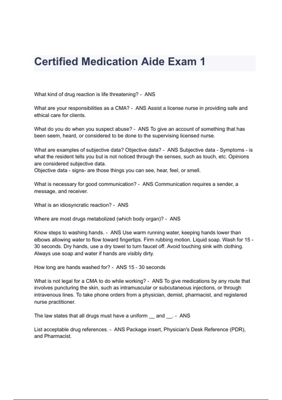 Certified Medication Aide Exam 1 Questions & Answers 2023 ( A+ GRADED 100% VERIFIED)