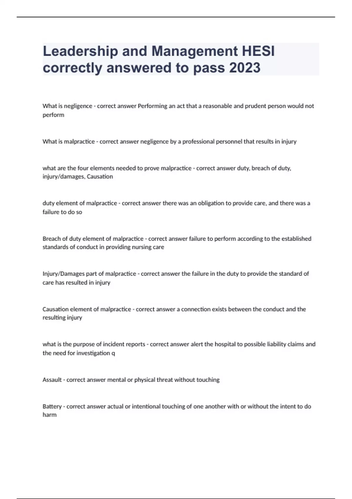 Leadership and Management HESI correctly answered to pass 2023 What is negligence - correct answer Performing an act that a reasonable and prudent person would not perform What is malpractice - correct answer negligence by a professional personnel that results in injury what are the four elements needed to prove malpractice - correct answer duty, breach of duty, injury/damages, Causation duty element of malpractice - correct answer there was an obligation to provide care, and there was a failure to do so Breach of duty element of malpractice - correct answer failure to perform according to the established standards of conduct in providing nursing care Injury/Damages part of malpractice - correct answer the failure in the duty to provide the standard of care has resulted in injury Causation element of malpractice - correct answer a connection exists between the conduct and the resulting injury what is the purpose of incident reports - correct answer alert the hospital to possible liability claims and the need for investigation q Assault - correct answer mental or physical threat without touching Battery - correct answer actual or intentional touching of one another with or without the intent to do harm Invasion of privacy - correct answer trespassing on another body or personality False imprisonment - correct answer confinement without authorization Defamation - correct answer divulgence of privileged information or communication Fraud - correct answer illegal activities and willful/purposeful misrepresentation that could cause loss or harm what does a involuntary admission require - correct answer certification by the health care provider that the person is a danger to self or others individuals have the right to a hearing within a certain number of hours or days, what can a person deemed incompetent not do - correct answer vote, make contracts or wills, drive, sue or be sued, hold a professional license Who should explain and describe a surgical procedure to the patient including the complications as well as expected results - correct answer the health care provider What is the nurses responsibility with consent - correct answer make sure that the consent form is signed , the nurse must document the patient was given the information and agreed to it