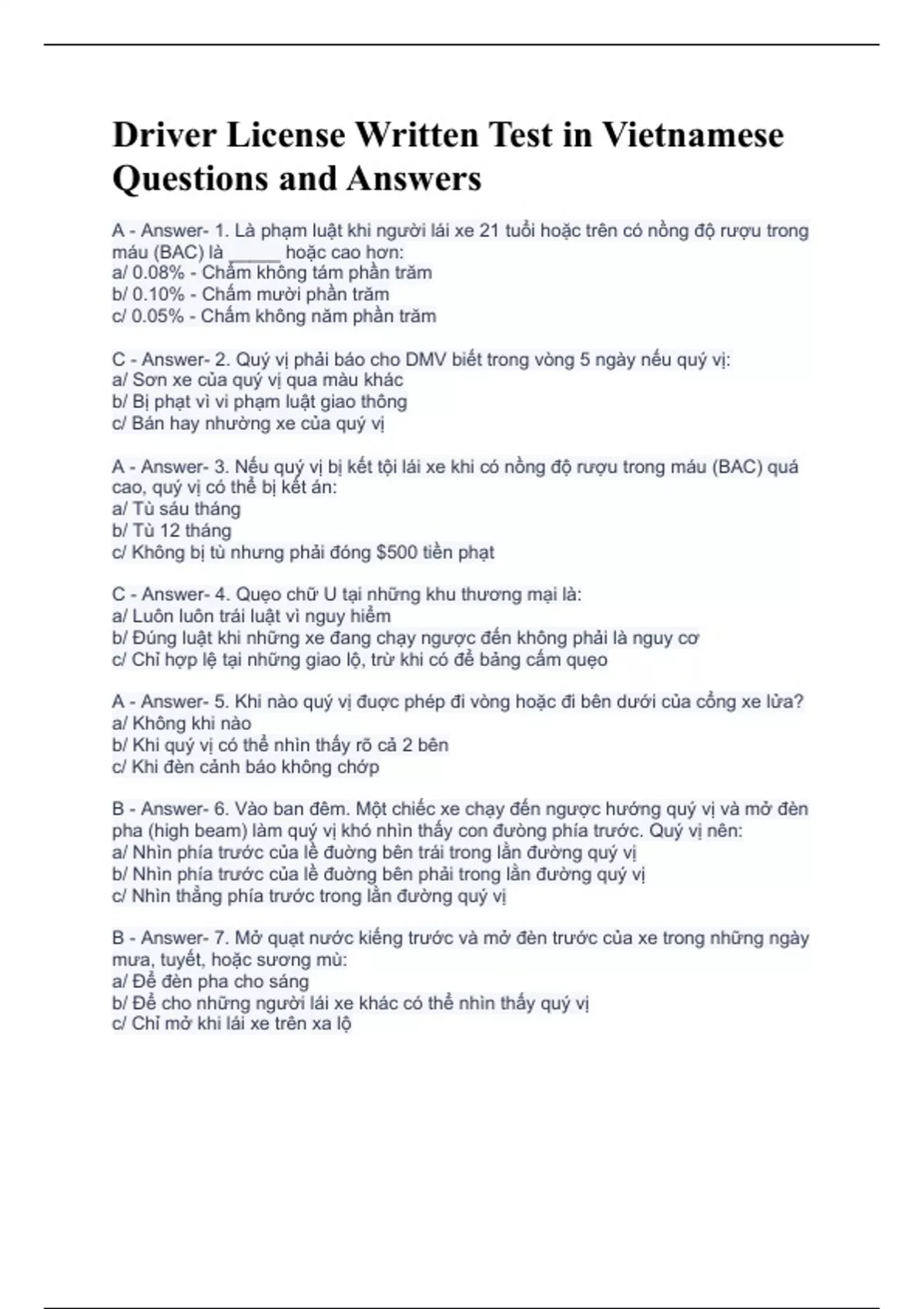 A - Answer- 1. Là phạm luật khi người lái xe 21 tuổi hoặc trên có nồng độ rượu trong máu (BAC) là _____ hoặc cao hơn: a/ 0.08% - Chấm không tám phần trăm b/ 0.10% - Chấm mười phần trăm c/ 0.05% - Chấm không năm phần trăm C - Answer- 2. Quý vị phải báo cho DMV biết trong vòng 5 ngày nếu quý vị: a/ Sơn xe của quý vị qua màu khác b/ Bị phạt vì vi phạm luật giao thông c/ Bán hay nhường xe của quý vị A - Answer- 3. Nếu quý vị bị kết tội lái xe khi có nồng độ rượu trong máu (BAC) quá cao, quý vị có thể bị kết án: a/ Tù sáu tháng b/ Tù 12 tháng c/ Không bị tù nhưng phải đóng $500 tiền phạt C - Answer- 4. Quẹo chữ U tại những khu thương mại là: a/ Luôn luôn trái luật vì nguy hiểm b/ Đúng luật khi những xe đang chạy ngược đến không phải là nguy cơ c/ Chỉ hợp lệ tại những giao lộ, trừ khi có để bảng cấm quẹo A - Answer- 5. Khi nào quý vị đuợc phép đi vòng hoặc đi bên dưới của cổng xe lửa? a/ Không khi nào b/ Khi quý vị có thể nhìn thấy rõ cả 2 bên c/ Khi đèn cảnh báo không chớp B - Answer- 6. Vào ban đêm. Một chiếc xe chạy đến ngược hướng quý vị và mở đèn pha (high beam) làm quý vị khó nhìn thấy con đưòng phía trước. Quý vị nên: a/ Nhìn phía trước của lề đuờng bên trái trong lằn đường quý vị b/ Nhìn phía trước của lề đuờng bên phải trong lằn đường quý vị c/ Nhìn thẳng phía trước trong lằn đường quý vị B - Answer- 7. Mở quạt nước kiếng trước và mở đèn trước của xe trong những ngày mưa, tuyết, hoặc sương mù: a/ Để đèn pha cho sáng b/ Để cho những người lái xe khác có thể nhìn thấy quý vị c/ Chỉ mở khi lái xe trên xa lộ C - Answer- 8. Trên con đường có 2 lằn cùng chiều với quý vị. Quý vị đang lái ở lằn đuờng bên trái và có rất nhiếu xe qua mặt quý vị từ bên phải. Nếu người lái sau quý vị muốn lái nhanh hơn, quý vị nên: a/ Ở trong lằn đường của mình vì như vậy quý vị sẽ không làm cản trở dòng xe lưu thông b/ Lái xe vào lề đường bên trái để cho xe phía sau qua mặt - c/ Chạy qua lằn đuờng bên phải khi an toàn A - Answer- 9. Tại giao lộ không có đèn kiểm soát giao thông khiến quý vị không thể nhìn thấy các xe băng ngang cho đến khi chạy đến giao lộ, vận tốc giới hạn ở chỗ đó là: a/ 15 dặm một giờ b/ 25 dặm một giờ c/ 20 dặm một giờ C - Answer- 10. Nếu xe của quý vị bắt đầu bị mất độ bám trên mặt đuờng (xe bị lướt trên mặt đường khi có nước), quý vị nên: a/ Lái xe ở một vận tốc cố định để lấy lại độ bám b/ Đạp mạnh vào thắng để cho xe khỏi bị trượt đi c/ Giảm vận tốc từ từ và đừng đạp thắng B - Answer- 11. Bảng hiệu màu trắng (trong đó có chữ: LEFT TURN YIELD ON GREEN) có nghĩa là quý vị: a/ Chỉ đuợc quẹo trái khi có mũi tên màu xanh b/ Có thể quẹo trái khi đèn xanh lúc an toàn c/ Phải chờ cho đến khi đèn xanh trước khi quẹo trái A - Answer- 12. Khi quý vị đậu xe xuống dốc bên cạnh lề đường, nên quay bánh xe trước theo hướng nào? a/ Quay vào trong lề đường b/ Quay ra ngoài lề đường c/ Song song với lề đường C - Answer- 13. Khi lái xe, quý vị nên nhìn phía trước của xe quý vị từ 10 đến 15 giây: a/ Và chú ý đến giữa con đường b/ Bởi vì đây là điều đòi hỏi để chạy đúng luật c/ Để sớm nhìn thấy những nguy hiểm có thể xảy ra A - Answer- 14. Bảng hiệu hình thoi màu cam (trong đó có chữ: SHOULDER WORK AHEAD) có nghĩa là: a/ Phía trước đang làm đường b/ Bởi vì đây là điều đòi hỏi để xe chạy đúng luật c/ Phải đi đường vòng ở phía trước A - Answer- 15. Là trái luật để đi vào giao lộ khi: a/ Quý vị không thể chạy qua hết hẳn con đường trước khi đèn đổi sang màu đỏ - logic b/ Đèn đang chớp qua vàng và quý vị không ngừng lại đuợc c/ Đèn đang vàng và quý vị không thể ngừng an toàn B - Answer- 16. Khi nào quý vị chỉ cần mở đèn đậu xe trong lúc đang lái? a/ 30 phút sau khi mặt trời lặn hoặc 30 phút trước khi mặt trời mọc b/ Không khi nào c/ Vào những ngày có sương mù khi nhìn không rõ A - Answer- 17. Quý vị không đuợc ngừng xe bất cứ lúc nào: a/ Ở chỗ gần lề đường có sơn đỏ b/ Ở chỗ gần lề đường có sơn vàng c/ Phía trước trường học khi đang có trẻ em A - Answer- 18. Bảng hiệu hình thoi màu vàng (trong đó có hình: MŨI TÊN VUÔNG CHỈ TRÁI) có nghĩa là: a/ Có khúc quẹo gắt bên trái b/ Lằn đường chỉ đuợc quẹo trái c/ Chỉ được phép quẹo trái khi có mũi tên xanh B - Answer- 19. Những điều sau đây là cách đúng nhất để đổi lằn đường: a/ Bật đèn báo hiệu, nhìn vào kiếng của xe, và sau đó đổi lằn đường b/ Bật đèn báo hiệu, nhìn vào kiếng của xe, và quay đầu nhìn qua vai trước khi quý vị đổi lằn đường c/ Nhìn vào kiếng, quay đầu nhìn qua vai, sau đó đổi lằn đường B - Answer- 20. Quý vị nên tăng thêm khoảng cách giữa xe quý vị và xe trước khi quý vị: a/ Theo sau một xe nhỏ b/ Đang bị bám sát bởi một xe khác c/ Lái chậm hơn vận tốc giới hạn ghi trên bảng B - Answer- 21. Quý vị đang lái 55 MPH trong lằn 
