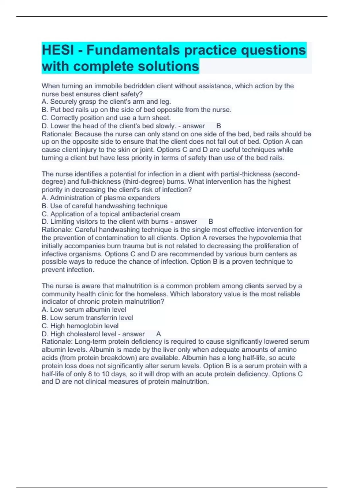 HESI - Fundamentals practice questions with complete solutions When turning an immobile bedridden client without assistance, which action by the nurse best ensures client safety? A. Securely grasp the client's arm and leg. B. Put bed rails up on the side of bed opposite from the nurse. C. Correctly position and use a turn sheet. D. Lower the head of the client's bed slowly. B Rationale: Because the nurse can only stand on one side of the bed, bed rails should be up on the opposite side to ensure that the client does not fall out of bed. Option A can cause client injury to the skin or joint. Options C and D are useful techniques while turning a client but have less priority in terms of safety than use of the bed rails. The nurse identifies a potential for infection in a client with partial-thickness (second-degree) and full-thickness (third-degree) burns. What intervention has the highest priority in decreasing the client's risk of infection? A. Administration of plasma expanders B. Use of careful handwashing technique C. Application of a topical antibacterial cream D. Limiting visitors to the client with burns B Rationale: Careful handwashing technique is the single most effective intervention for the prevention of contamination to all clients. Option A reverses the hypovolemia that initially accompanies burn trauma but is not related to decreasing the proliferation of infective organisms. Options C and D are recommended by various burn centers as possible ways to reduce the chance of infection. Option B is a proven technique to prevent infection. The nurse is aware that malnutrition is a common problem among clients served by a community health clinic for the homeless. Which laboratory value is the most reliable indicator of chronic protein malnutrition? A. Low serum albumin level B. Low serum transferrin level C. High hemoglobin level D. High cholesterol level A Rationale: Long-term protein deficiency is required to cause significantly lowered serum albumin levels. Albumin is made by the liver only when adequate amounts of amino acids (from protein breakdown) are available. Albumin has a long half-life, so acute protein loss does not significantly alter serum levels. Option B is a serum protein with a half-life of only 8 to 10 days, so it will drop with an acute protein deficiency. Options C and D are not clinical measures of protein malnutrition. In completing a client's preoperative routine, the nurse finds that the operative permit is not signed. The client begins to ask more questions about the surgical procedure. Which action should the nurse take next? A. Witness the client's signature to the permit. B. Answer the client's questions about the surgery. C. Inform the surgeon that the operative permit is not signed and the client has questions about the surgery. D. Reassure the client that the surgeon will answer any questions before the anesthesia is administered. C Rationale: The surgeon should be informed immediately that the permit is not signed. It is the surgeon's responsibility to explain the procedure to the client and obtain the client's signature on the permit. Although the nurse can witness an operative permit, the procedure must first be explained by the health care provider or surgeon, including answering the client's questions. The client's questions should be addressed before the permit is signed. The nurse is assessing several clients prior to surgery. Which factor in a client's history poses the greatest threat for complications to occur during surgery? A. Taking birth control pills for the past 2 years B. Taking anticoagulants for the past year C. Recently completing antibiotic therapy D. Having taken laxatives PRN for the last 6 months B Rationale: Anticoagulants increase the risk for bleeding during surgery, which can pose a threat for the development of surgical complications. The health care provider should be informed that the client is taking these drugs. Although clients who take birth control pills may be more susceptible to the development of thrombi, such problems usually occur postoperatively. A client with option C or D is at less of a surgical risk than with option B. When assisting a client from the bed to a chair, which procedure is best for the nurse to follow? A. Place the chair parallel to the bed, with its back toward the head of the bed and assist the client in moving to the chair. B. With the nurse's feet spread apart and knees aligned with the client's knees, stand and pivot the client into the chair. C. Assist the client to a standing position by gently lifting upward, underneath the axillae. D. Stand beside the client, place the client's arms around the nurse's neck, and gently move the client to the chair. B Rationale: Option B describes the correct positioning of the nurse and affords the nurse a wide base of support while stabilizing the client's knees when assisting to a standing position. The chair should be placed at a 45-degree angle to the bed, with the back of the chair toward the head of the bed. Clients should never be lifted under the axillae; this could damage nerves and strain the nurse's back. The client should be instructed to use the arms of the chair and should never place his or her arms around the nurse's neck; this places undue stress on the nurse's neck and back and increases the risk for a fall. Which step(s) should the nurse take when administering ear drops to an adult client? (Select all that apply.) A. Place the client in a side-lying position. B. Pull the auricle upward and outward. C. Hold the dropper 6 cm above the ear canal. D. Place a cotton ball into the inner canal. E. Pull the auricle down and back. A, B Rationale: The correct answers (A and B) are the appropriate administration of ear drops. The dropper should be held 1 cm (½ inch) above the ear canal (C). A cotton ball should be placed in the outermost canal (D). The auricle is pulled down and back for a child younger than 3 years of age, but not an adul