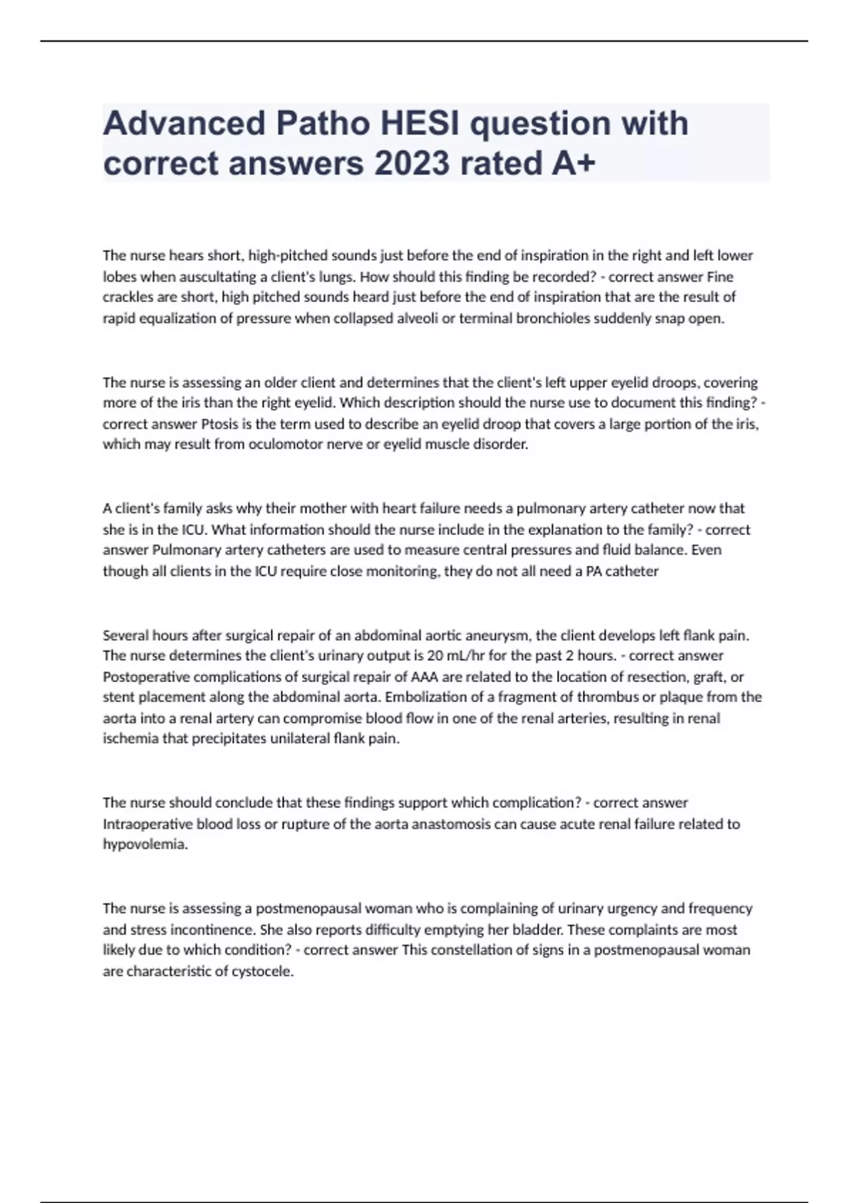 Advanced Patho HESI question with correct answers 2023 rated A+The nurse hears short, high-pitched sounds just before the end of inspiration in the right and left lower lobes when auscultating a client's lungs. How should this finding be recorded? - correct answer Fine crackles are short, high pitched sounds heard just before the end of inspiration that are the result of rapid equalization of pressure when collapsed alveoli or terminal bronchioles suddenly snap open. The nurse is assessing an older client and determines that the client's left upper eyelid droops, covering more of the iris than the right eyelid. Which description should the nurse use to document this finding? - correct answer Ptosis is the term used to describe an eyelid droop that covers a large portion of the iris, which may result from oculomotor nerve or eyelid muscle disorder. A client's family asks why their mother with heart failure needs a pulmonary artery catheter now that she is in the ICU. What information should the nurse include in the explanation to the family? - correct answer Pulmonary artery catheters are used to measure central pressures and fluid balance. Even though all clients in the ICU require close monitoring, they do not all need a PA catheter Several hours after surgical repair of an abdominal aortic aneurysm, the client develops left flank pain. The nurse determines the client's urinary output is 20 mL/hr for the past 2 hours. - correct answer Postoperative complications of surgical repair of AAA are related to the location of resection, graft, or stent placement along the abdominal aorta. Embolization of a fragment of thrombus or plaque from the aorta into a renal artery can compromise blood flow in one of the renal arteries, resulting in renal ischemia that precipitates unilateral flank pain. The nurse should conclude that these findings support which complication? - correct answer Intraoperative blood loss or rupture of the aorta anastomosis can cause acute renal failure related to hypovolemia. The nurse is assessing a postmenopausal woman who is complaining of urinary urgency and frequency and stress incontinence. She also reports difficulty emptying her bladder. These complaints are most likely due to which condition? - correct answer This constellation of signs in a postmenopausal woman are characteristic of cystocele. A male client who has never smoked by has had COPD is now being assessed