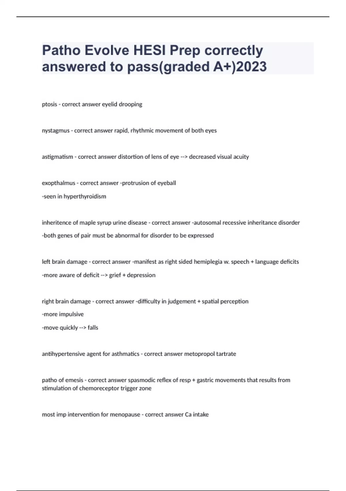 Patho Evolve HESI Prep correctly answered to pass(graded A+)2023ptosis - correct answer eyelid drooping nystagmus - correct answer rapid, rhythmic movement of both eyes astigmatism - correct answer distortion of lens of eye --> decreased visual acuity exopthalmus - correct answer -protrusion of eyeball -seen in hyperthyroidism inheritence of maple syrup urine disease - correct answer -autosomal recessive inheritance disorder -both genes of pair must be abnormal for disorder to be expressed left brain damage - correct answer -manifest as right sided hemiplegia w. speech + language deficits -more aware of deficit --> grief + depression right brain damage - correct answer -difficulty in judgement + spatial perception -more impulsive -move quickly --> falls antihypertensive agent for asthmatics - correct answer metopropol tartrate patho of emesis - correct answer spasmodic reflex of resp + gastric movements that results from stimulation of chemoreceptor trigger zone most imp intervention for menopause - correct answer Ca intake