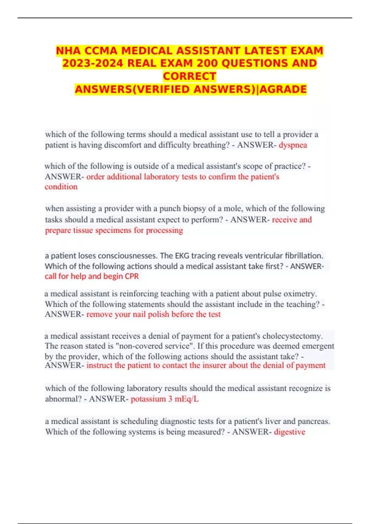 NHA CCMA MEDICAL ASSISTANT LATEST EXAM REAL EXAM 200 QUESTIONS AND CORRECT ANSWERS(VERIFIED ANSWERS)|AGRADENHA CCMA MEDICAL ASSISTANT LATEST EXAM REAL EXAM 200 QUESTIONS AND CORRECT ANSWERS(VERIFIED ANSWERS)|AGRADE