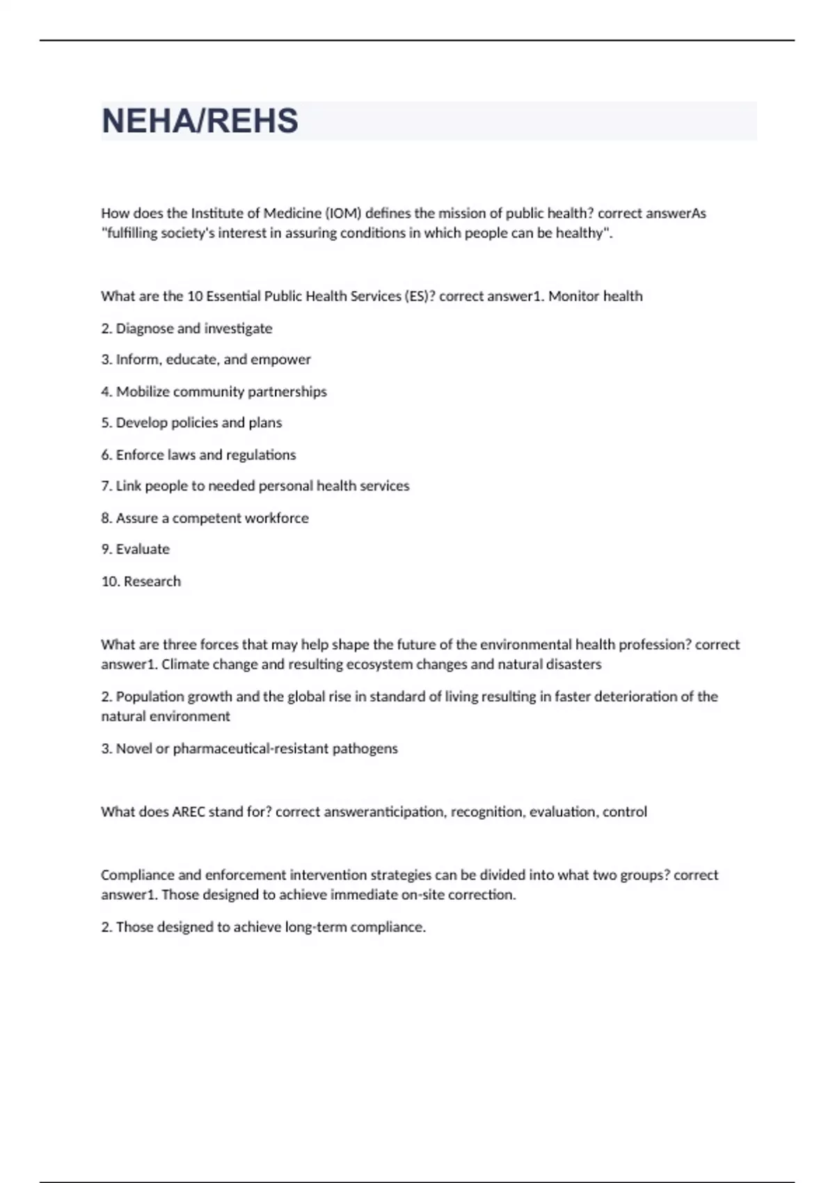 How does the Institute of Medicine (IOM) defines the mission of public health? As "fulfilling society's interest in assuring conditions in which people can be healthy". What are the 10 Essential Public Health Services (ES)? 1. Monitor health 2. Diagnose and investigate 3. Inform, educate, and empower 4. Mobilize community partnerships 5. Develop policies and plans 6. Enforce laws and regulations 7. Link people to needed personal health services 8. Assure a competent workforce 9. Evaluate 10. Research What are three forces that may help shape the future of the environmental health profession? 1. Climate change and resulting ecosystem changes and natural disasters 2. Population growth and the global rise in standard of living resulting in faster deterioration of the natural environment 3. Novel or pharmaceutical-resistant pathogens What does AREC stand for? anticipation, recognition, evaluation, control Compliance and enforcement intervention strategies can be divided into what two groups? 1. Those designed to achieve immediate on-site correction. 2. Those designed to achieve long-term compliance. What is a Standard Operating Procedure (SOP)? A standard operation procedure (SOP) is a written process that provides consistent guidance to employees within an organization as to how they should properly complete a given task in a uniform manner. It provides detailed steps and details the tools necessary to complete the task. What is Malfeasance? The doing of an act that is wrongful and that is known to be wholly unauthorized by the official. What is Misfeasance? The doing of an authorized act in an unauthorized manner. What is Nonfeasance? The failure to perform an official duty without sufficient excuse.