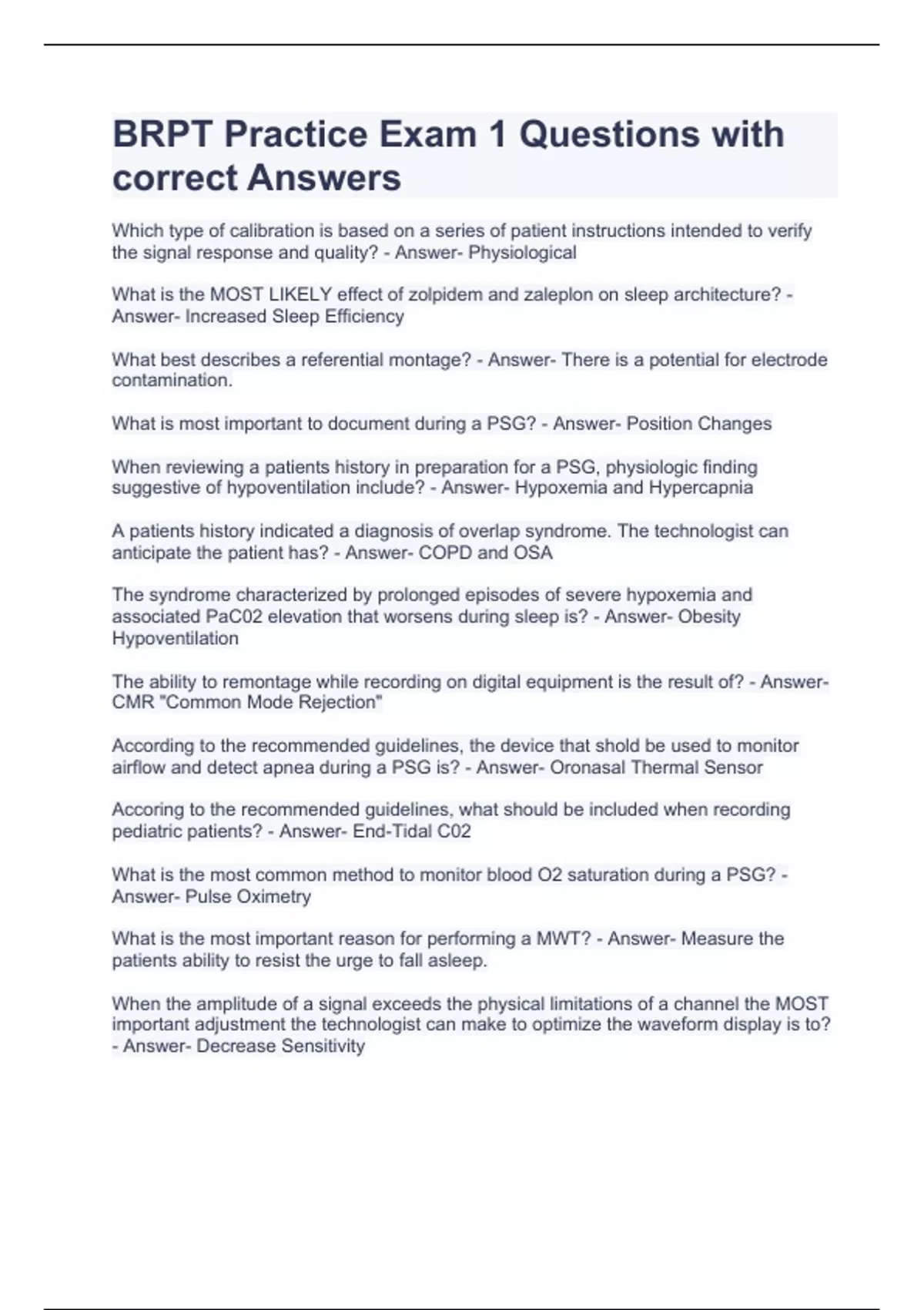 Which type of calibration is based on a series of patient instructions intended to verify the signal response and quality? - Answer- Physiological What is the MOST LIKELY effect of zolpidem and zaleplon on sleep architecture? - Answer- Increased Sleep Efficiency What best describes a referential montage? - Answer- There is a potential for electrode contamination. What is most important to document during a PSG? - Answer- Position Changes When reviewing a patients history in preparation for a PSG, physiologic finding suggestive of hypoventilation include? - Answer- Hypoxemia and Hypercapnia A patients history indicated a diagnosis of overlap syndrome. The technologist can anticipate the patient has? - Answer- COPD and OSA The syndrome characterized by prolonged episodes of severe hypoxemia and associated PaC02 elevation that worsens during sleep is? - Answer- Obesity Hypoventilation The ability to remontage while recording on digital equipment is the result of? - Answer- CMR "Common Mode Rejection" According to the recommended guidelines, the device that shold be used to monitor airflow and detect apnea during a PSG is? - Answer- Oronasal Thermal Sensor Accoring to the recommended guidelines, what should be included when recording pediatric patients? - Answer- End-Tidal C02 What is the most common method to monitor blood O2 saturation during a PSG? - Answer- Pulse Oximetry What is the most important reason for performing a MWT? - Answer- Measure the patients ability to resist the urge to fall asleep. When the amplitude of a signal exceeds the physical limitations of a channel the MOST important adjustment the technologist can make to optimize the waveform display is to? - Answer- Decrease Sensitivity A self-reporting tool used to evaluate subjective sleep quality and disturbance over the previous month is? - Answe