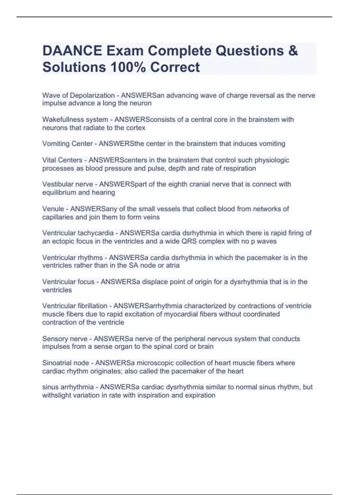 Wave of Depolarization - ANSWERSan advancing wave of charge reversal as the nerve impulse advance a long the neuron Wakefullness system - ANSWERSconsists of a central core in the brainstem with neurons that radiate to the cortex Vomiting Center - ANSWERSthe center in the brainstem that induces vomiting Vital Centers - ANSWERScenters in the brainstem that control such physiologic processes as blood pressure and pulse, depth and rate of respiration Vestibular nerve - ANSWERSpart of the eighth cranial nerve that is connect with equilibrium and hearing Venule - ANSWERSany of the small vessels that collect blood from networks of capillaries and join them to form veins Ventricular tachycardia - ANSWERSa cardia dsrhythmia in which there is rapid firing of an ectopic focus in the ventricles and a wide QRS complex with no p waves Ventricular rhythms - ANSWERSa cardia dsrhythmia in which the pacemaker is in the ventricles rather than in the SA node or atria Ventricular focus - ANSWERSa displace point of origin for a dysrhythmia that is in the ventricles Ventricular fibrillation - ANSWERSarrhythmia characterized by contractions of ventricle muscle fibers due to rapid excitation of myocardial fibers without coordinated contraction of the ventricle Sensory nerve - ANSWERSa nerve of the peripheral nervous system that conducts impulses from a sense organ to the spinal cord or brain Sinoatrial node - ANSWERSa microscopic collection of heart muscle fibers where cardiac rhythm originates; also called the pacemaker of the heart sinus arrhythmia - ANSWERSa cardiac dysrhythmia similar to normal sinus rhythm, but withslight variation in rate with inspiration and expiration sinus bradycardia - ANSWERScardiac dysrhythmia similar to norm