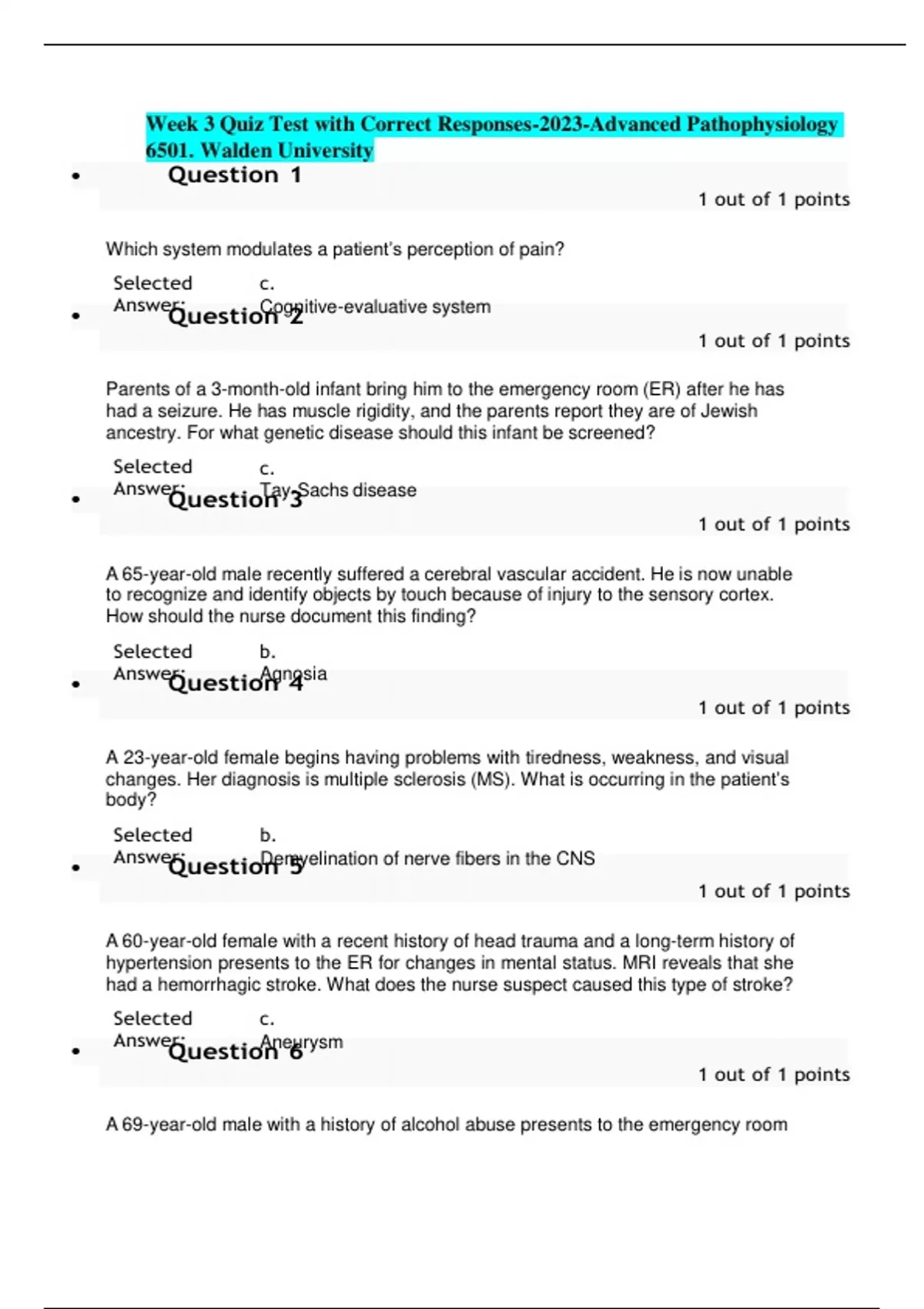 Week 3 Quiz Test with Correct Responses-2023-Advanced Pathophysiology 6501. Walden University