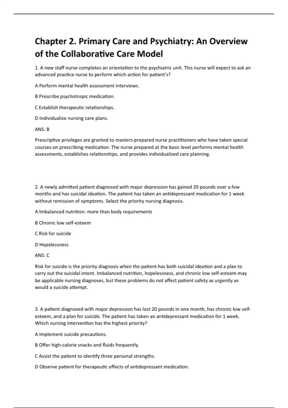 1. A new staff nurse completes an orientation to the psychiatric unit. This nurse will expect to ask an advanced practice nurse to perform which action for patient's? A Perform mental health assessment interviews. B Prescribe psychotropic medication. C Establish therapeutic relationships. D Individualize nursing care plans. ANS: B Prescriptive privileges are granted to masters-prepared nurse practitioners who have taken special courses on prescribing medication. The nurse prepared at the basic level performs mental health assessments, establishes relationships, and provides individualized care planning. 2. A newly admitted patient diagnosed with major depression has gained 20 pounds over a few months and has suicidal ideation. The patient has taken an antidepressant medication for 1 week without remission of symptoms. Select the priority nursing diagnosis. A Imbalanced nutrition: more than body requirements B Chronic low self-esteem C Risk for suicide D Hopelessness ANS: C