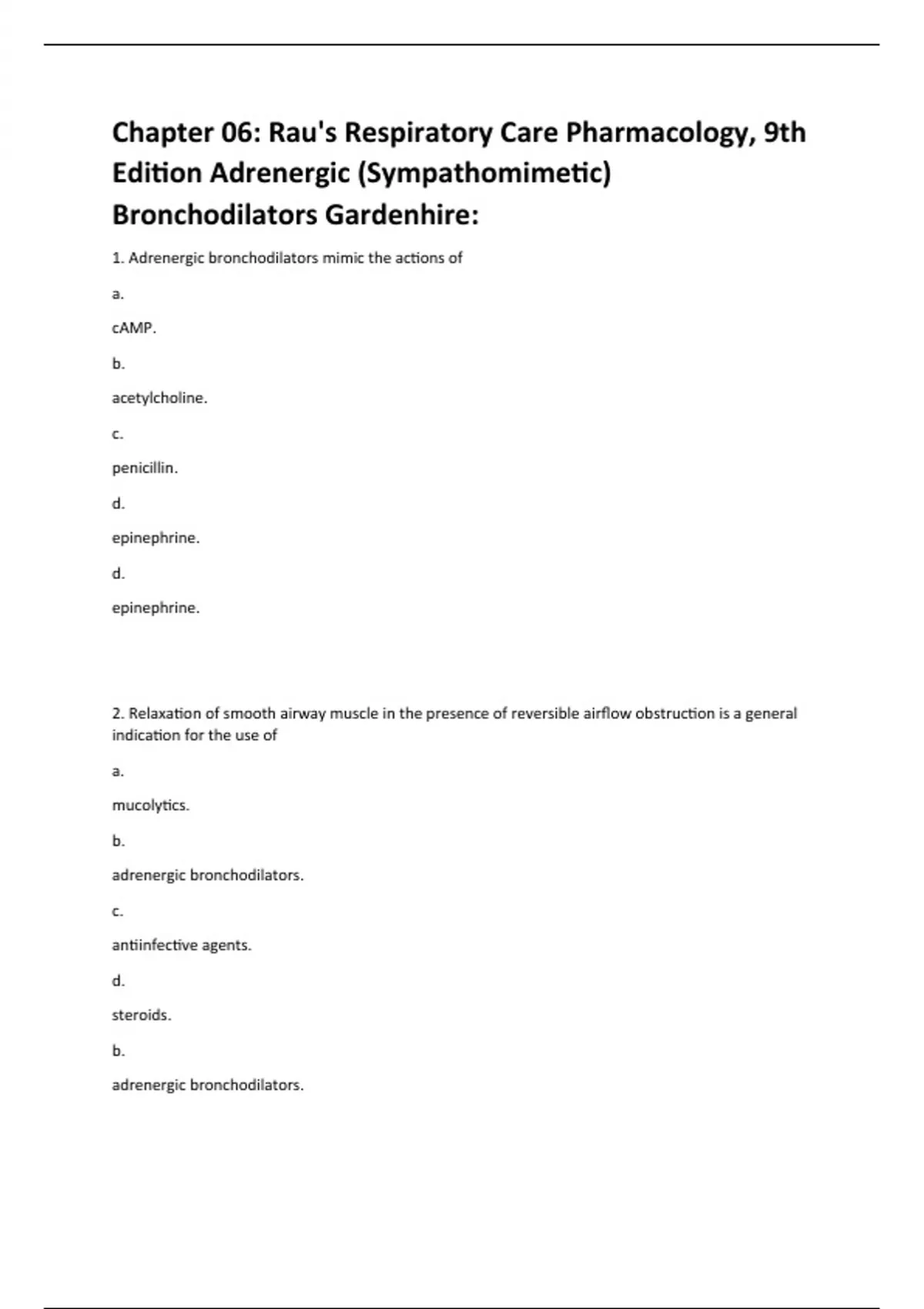 1. Adrenergic bronchodilators mimic the actions of a. cAMP. b. acetylcholine. c. penicillin. d. epinephrine. d. epinephrine. 2. Relaxation of smooth airway muscle in the presence of reversible airflow obstruction is a general indication for the use of a. mucolytics. b. adrenergic bronchodilators. c. antiinfective agents. d. steroids. b. adrenergic bronchodilators.