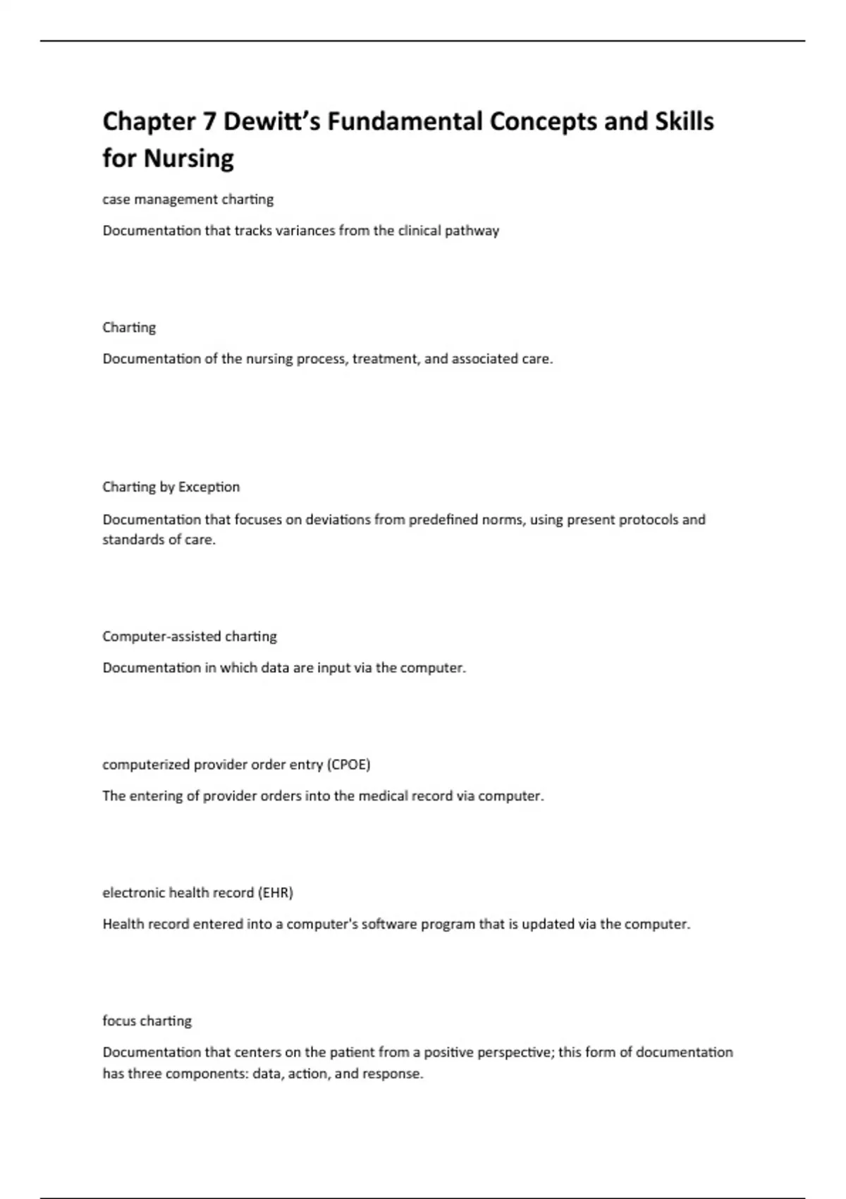 case management charting Documentation that tracks variances from the clinical pathway Charting Documentation of the nursing process, treatment, and associated care. Charting by Exception Documentation that focuses on deviations from predefined norms, using present protocols and standards of care. Computer-assisted charting Documentation in which data are input via the computer.