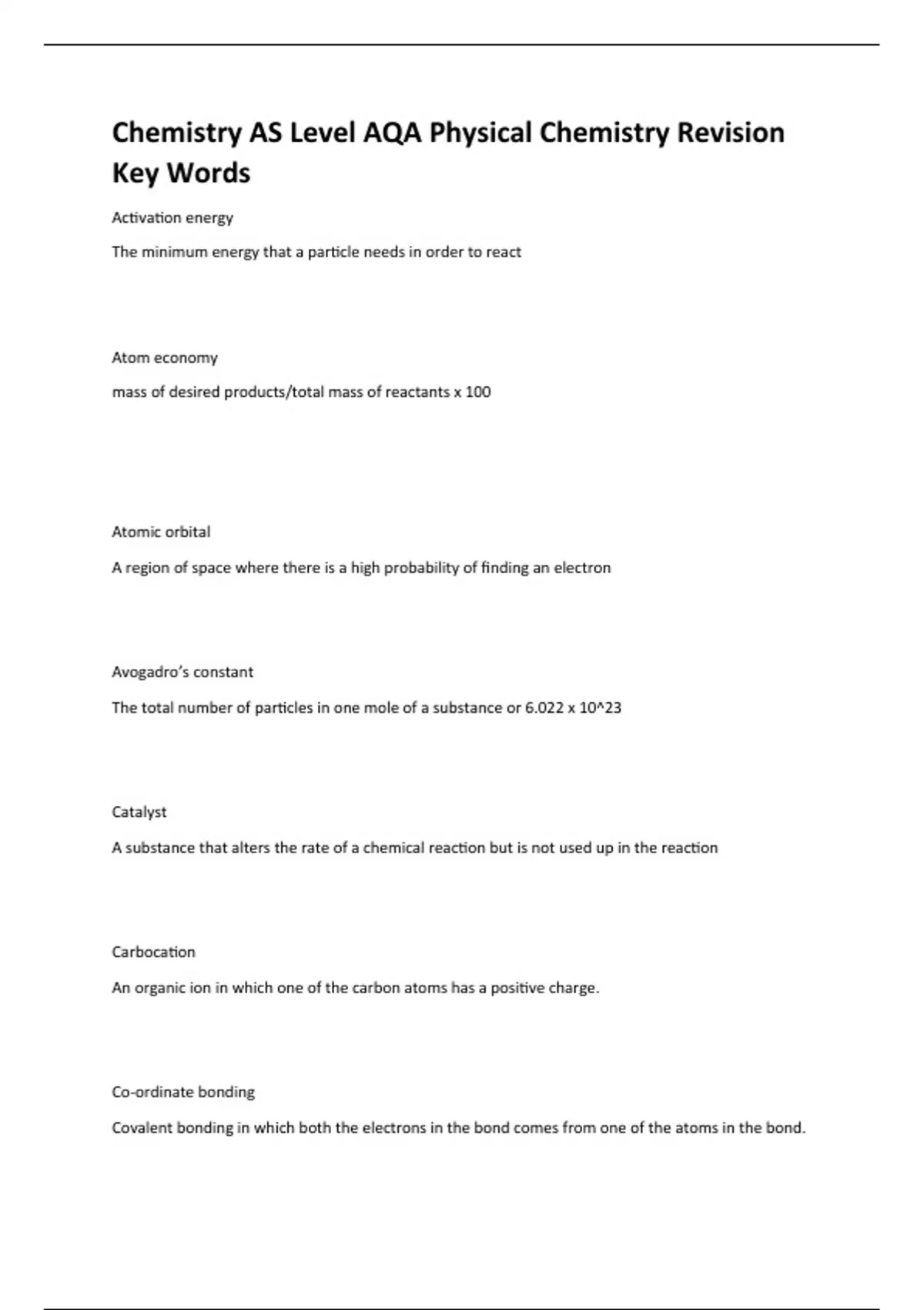 Activation energy The minimum energy that a particle needs in order to react Atom economy mass of desired products/total mass of reactants x 100 Atomic orbital A region of space where there is a high probability of finding an electron Avogadro’s constant The total number of particles in one mole of a substance or 6.022 x 10^23