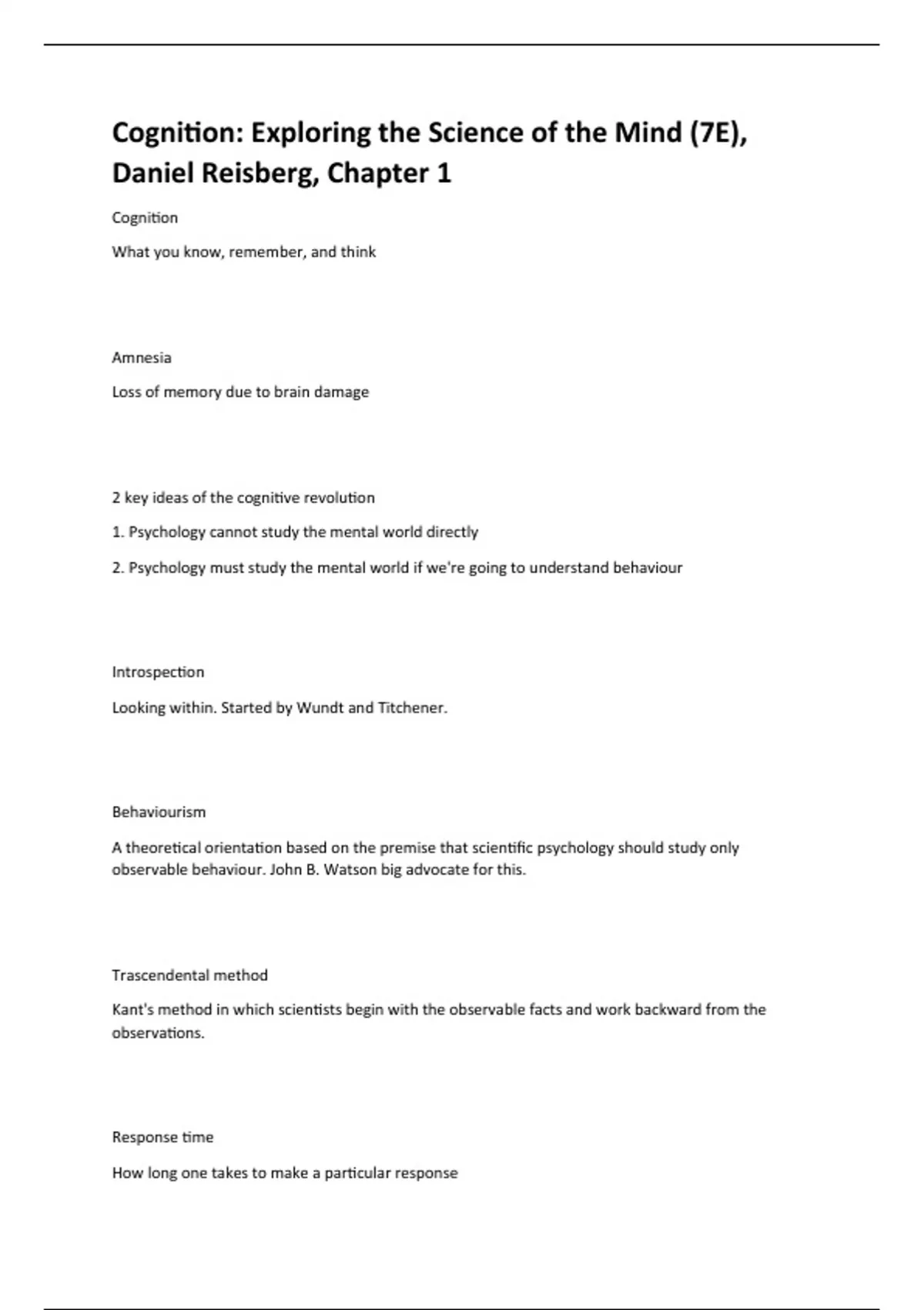 Cognition What you know, remember, and think Amnesia Loss of memory due to brain damage 2 key ideas of the cognitive revolution 1. Psychology cannot study the mental world directly 2. Psychology must study the mental world if we're going to understand behaviour Introspection Looking within. Started by Wundt and Titchener.