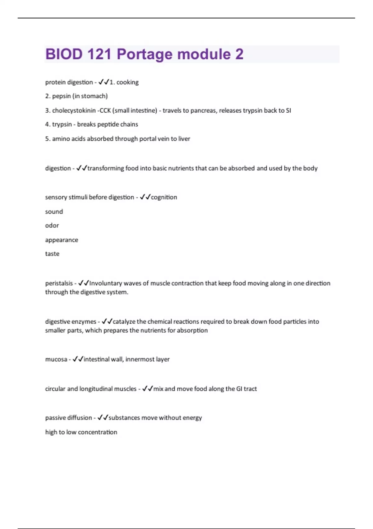 BIOD 121 Portage module 2 protein digestion - 1. cooking 2. pepsin (in stomach) 3. cholecystokinin -CCK (small intestine) - travels to pancreas, releases trypsin back to SI 4. trypsin - breaks peptide chains 5. amino acids absorbed through portal vein to liver digestion - transforming food into basic nutrients that can be absorbed and used by the body sensory stimuli before digestion - cognition sound odor appearance taste peristalsis - Involuntary waves of muscle contraction that keep food moving along in one direction through the digestive system. digestive enzymes - catalyze the chemical reactions required to break down food particles into smaller parts, which prepares the nutrients for absorption mucosa - intestinal wall, innermost layer circular and longitudinal muscles - mix and move food along the GI tract passive diffusion - substances move without energy high to low concentrationfacilitated diffusion - special protein carrier is required to help substances cross in or out of the cell high to low concentration active transport - requires energy low to high concentration GI tract 6 main parts - 1 - mouth 2 - esophagus 3 - stomach 4 - small intestine 5 - large intestine 6 - rectum GI tract accessory organs - salivary glands, liver, gallbladder, pancreas mouth - alter food particles for swallowing mechanical and chemical digestion saliva - mucus plus digestive enzymes mucus - lubricates food particles for swallowing salivary amylase - Enzyme in saliva that breaks down starch lingual lipase - a fat-splitting enzyme secreted by cells at the base of the tongue esophagus - transports food to the stomachepiglottis - a flap of cartilage that covers the trachea while swallowing sphincter muscle - circular muscle at the end of esophagus, prevents backflow of food stomach - 4 cup capacity holds food 2-4 hrs until ready to pass into the small intestine store, mix, dissolve, and continue the digestion of food gastric juice - The acidic secretion of the stomach prepares proteins for digestion and activates enzymes pepsin - An enzyme present in gastric juice that breaks down proteins gastric lipase - enzyme to digest fat chyme - Partially digested, semiliquid food mixed with digestive enzymes and acids in the stomach moves to small intestine over 1-4 hrs gastrin - hormone secreted in the stomach controls acidity, counteracted by mucus produced when we think about eating and during ingestion Intrinsic factor - vital glycoprotein produced in the stomach. In order for vitamin B-12 to be absorbed, intrinsic factor must be present. pyloric sphincter - Controls passage of food from stomach to small intestine small intestine - vast majority of all digestion and absorption of nutrients occurs hereapprox 20 ft long villi - Fingerlike extensions of the intestinal mucosa folds that increase the surface area for absorption liver - secretes bile, stored in gallbladder gallbladder - stores bile until hormones indicate fat in sm int released into the duodenum through the common bile duct pancreas - releases a mixture of water, bicarbonate, and enzymes called pancreatic juice that breaks down carbohydrates, protein, and fat protects intestinal wall from acid also glucagon/insulin ileocecal sphincter - the ring-like muscle that controls the flow from the ileum of the small intestine into the cecum of the large intestine large intestine - remaining water and certain minerals (sodium, potassium, and chloride) can be absorbed in the large intestine 5 feet long, 4 sections - ascending, transverse, descending, sigmoid feces - solid wastes; stool remains in rectum until pushed out controlled by two anal sphincters role of mucus in colon - holds the feces together protects the intestine from digestive bacteria heartburn - acid refluxoccurs when the stomach acid comes up the esophagus primary cause: weak esophageal sphincter eating smaller meals that are low in fat, chewing food well, avoiding overeating, and limiting coffee, tea, alcohol, and certain spices constipation - (feces) are hard, dry, and infrequent, and it is a result of slow movement through the large intestine change in diet/medication - lower calcium, iron, increase fiber (grains, fruit, veg, nuts) w/ water diarrhea - loose, watery, and frequent stools, usually results from an infection or a disease increased fluid consumption to prevent dehydration. A diet of broth, tea, toast, and low fiber foods should be consumed, as tolerated. Diverticulosis - pouches push out through weak spots in the colon, if food trapped > infection > diverticulitis increase fiber to reduce straining IBS - bloating, abdominal pain, cramps, diarrhea, and/or constipation frequent small meals, low fat meals, high fiber intake, probiotics, and avoiding foods that trigger symptoms. ulcers - sores that can occur in the stomach, lower esophagus, or small intestine can be caused by certain bacteria (i.e. H. Pylori) or meds like NSAIDs fructose - fruit sugar galactose - milk sugar sucrose - glucose + fructoselactose - glucose + galactose maltose - glucose + glucose rare in foods complex carbohydrates - polysaccharides (starches and fibers) starches: sources include vegetables, beans, breads, pasta, and rice glycogen: storage form of glucose fiber: can't be digested insoluble fiber (non-fermentable) - Does not dissolve in water Not broken down by intestinal bacteria increases stool mass speeds passage through the large intestine soluble fiber (viscous) - Dissolves in water Broken down by intestinal bacteria Slows glucose absorption and can lower cholesterol Provides satiety to a meal functional fiber - Fiber that is added to a product Promotes intestinal health monosaccharide digestion - actively absorbed carrier protein as well as energy is required to absorb the nutrients from the small intestine into the cells fructose = facilitated absorption transported to the liver and either released as glucose into the blood stream, stored as glycogen for later use, or used for fat productionamylas