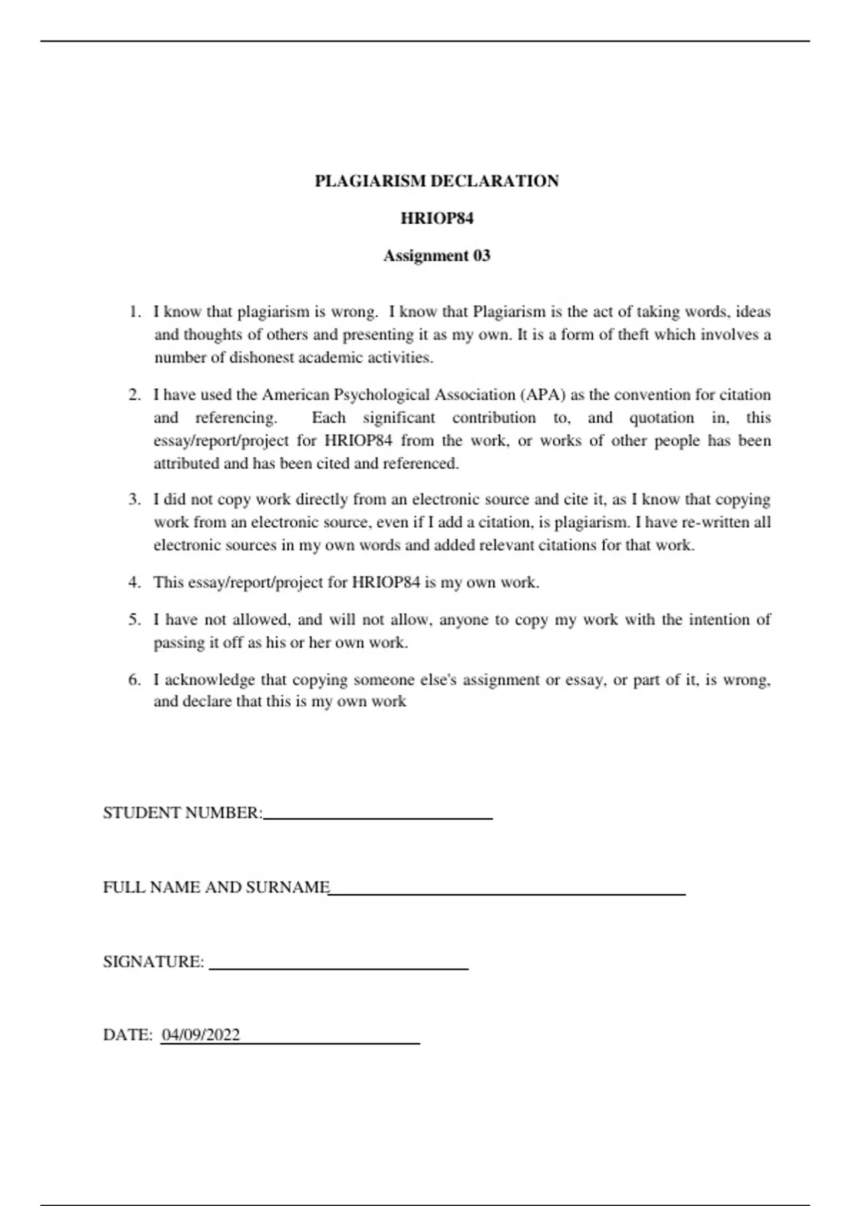 essay/report/project for HRIOP84 from the work, or works of other people has been