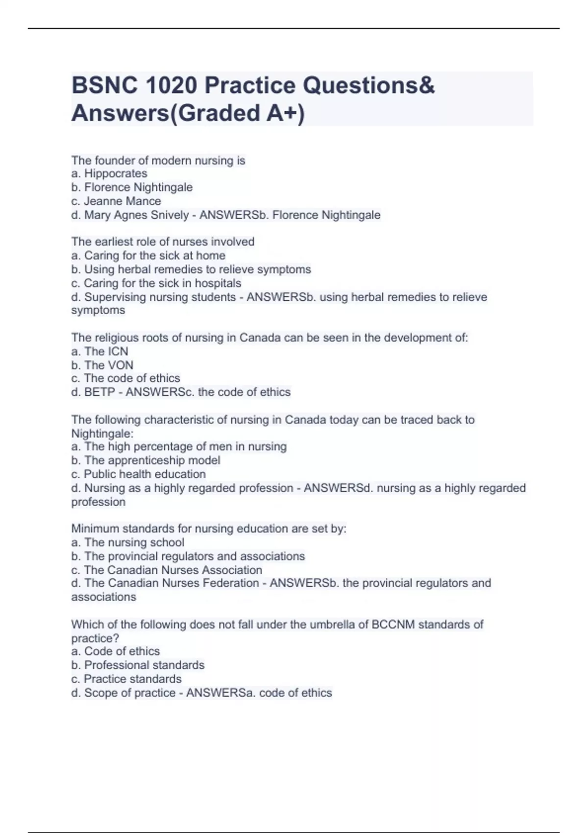 The founder of modern nursing is a. Hippocrates b. Florence Nightingale c. Jeanne Mance d. Mary Agnes Snively - ANSWERSb. Florence Nightingale The earliest role of nurses involved a. Caring for the sick at home b. Using herbal remedies to relieve symptoms c. Caring for the sick in hospitals d. Supervising nursing students - ANSWERSb. using herbal remedies to relieve symptoms The religious roots of nursing in Canada can be seen in the development of: a. The ICN b. The VON c. The code of ethics d. BETP - ANSWERSc. the code of ethics The following characteristic of nursing in Canada today can be traced back to Nightingale: a. The high percentage of men in nursing b. The apprenticeship model c. Public health education d. Nursing as a highly regarded profession - ANSWERSd. nursing as a highly regarded profession Minimum standards for nursing education are set by: a. The nursing school b. The provincial regulators and associations c. The Canadian Nurses Association d. The Canadian Nurses Federation - ANSWERSb. the provincial regulators and associations Which of the following does not fall under the umbrella of BCCNM standards of practice? a. Code of ethics b. Professional standards