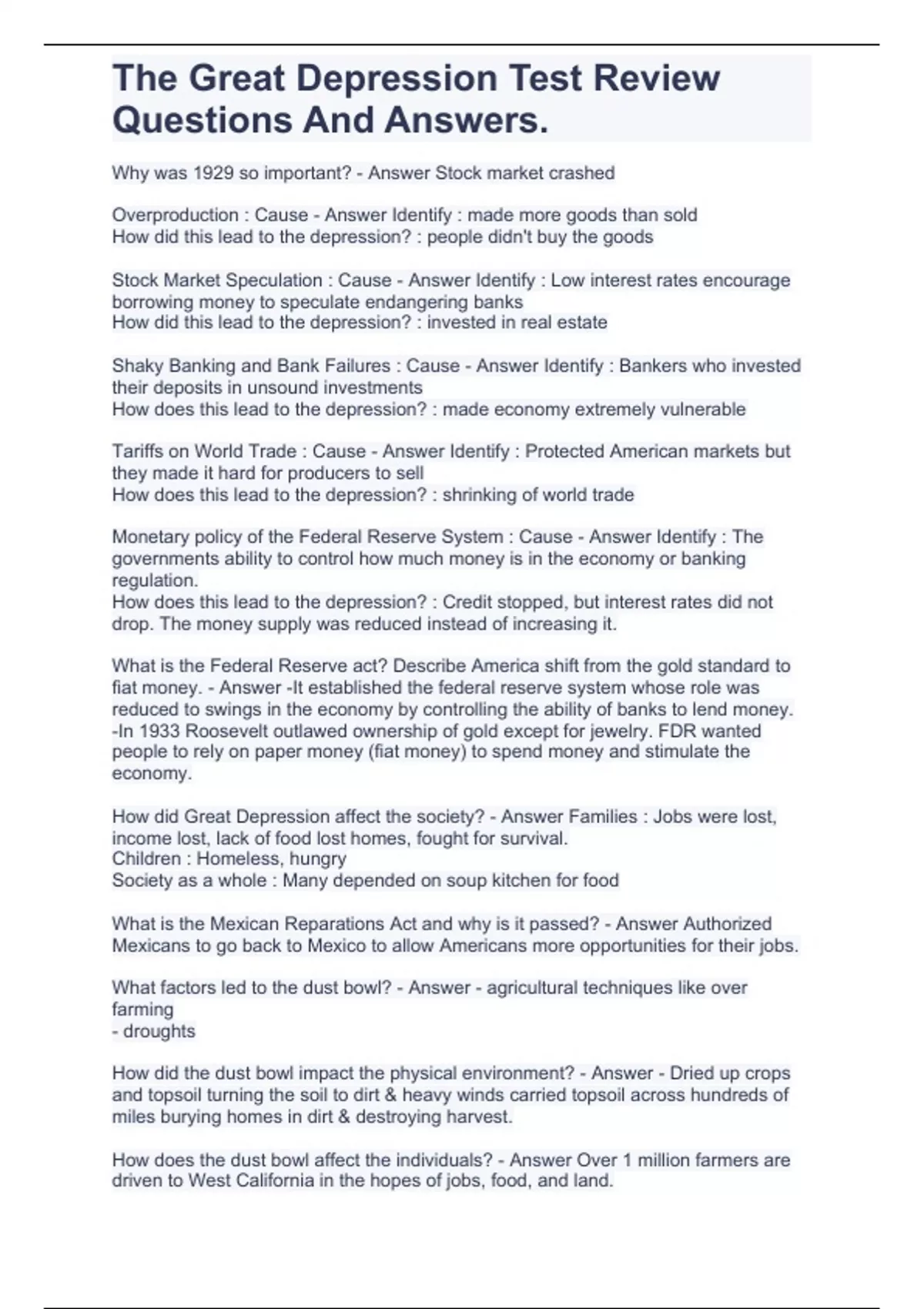 The Great Depression Test Review Questions And Answers.