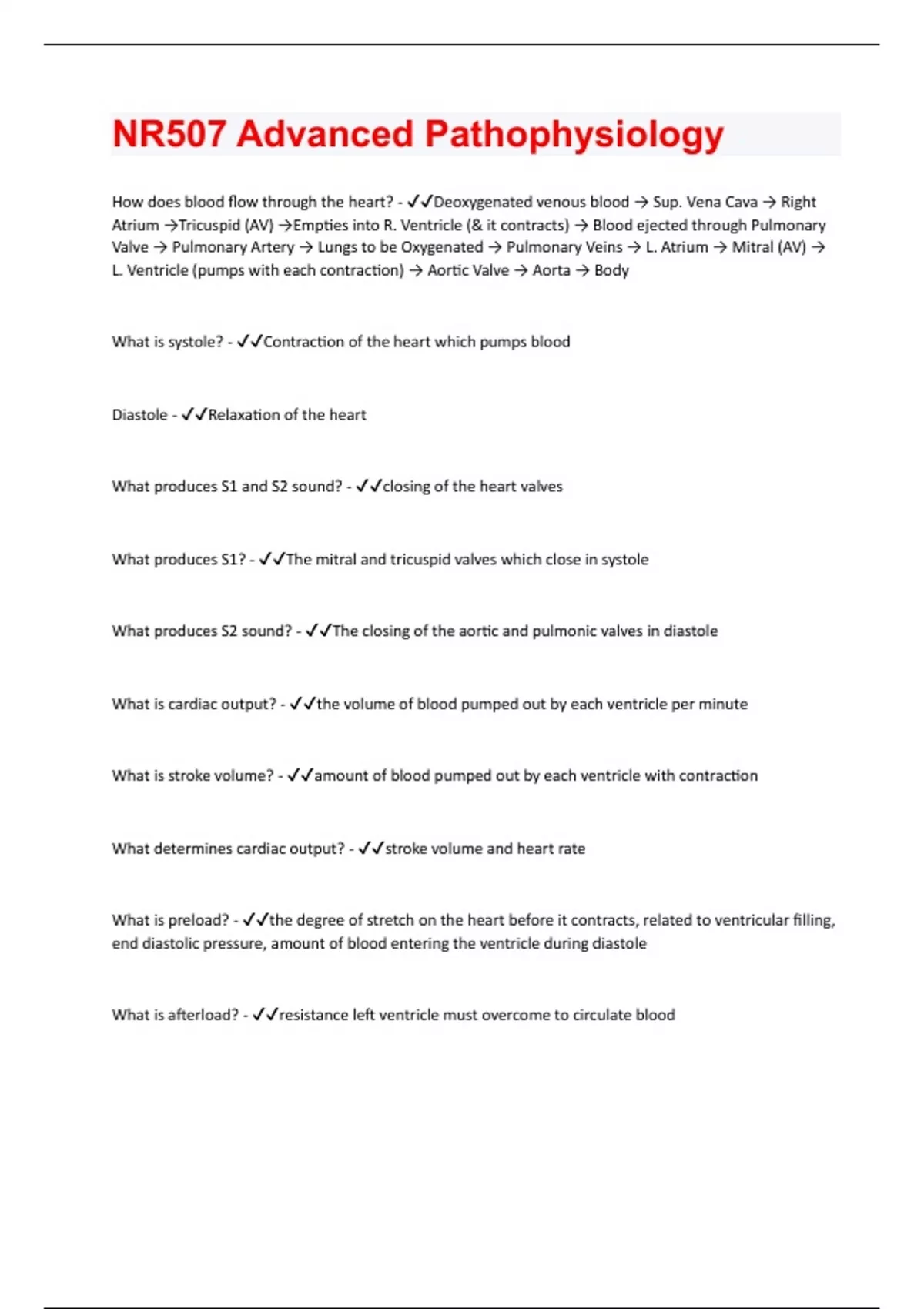 How does blood flow through the heart? - Deoxygenated venous blood → Sup. Vena Cava → Right Atrium →Tricuspid (AV) →Empties into R. Ventricle (& it contracts) → Blood ejected through Pulmonary Valve → Pulmonary Artery → Lungs to be Oxygenated → Pulmonary Veins → L. Atrium → Mitral (AV) → L. Ventricle (pumps with each contraction) → Aortic Valve → Aorta → Body What is systole? - Contraction of the heart which pumps blood Diastole - Relaxation of the heart What produces S1 and S2 sound? - closing of the heart valves What produces S1? - The mitral and tricuspid valves which close in systole What produces S2 sound? - The closing of the aortic and pulmonic valves in diastole What is cardiac output? - the volume of blood pumped out by each ventricle per minute What is stroke volume? - amount of blood pumped out by each ventricle with contraction What determines cardiac output? - stroke volume and heart rate What is preload? - the degree of stretch on the heart before it contracts, related to ventricular filling, end diastolic pressure, amount of blood entering the ventricle during diastole What is afterload? - resistance left ventricle must overcome to circulate blood