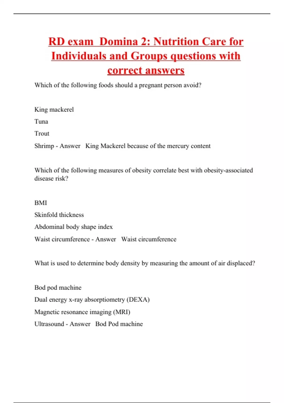 Which of the following foods should a pregnant person avoid? King mackerel Tuna Trout Shrimp - Answer King Mackerel because of the mercury content Which of the following measures of obesity correlate best with obesity-associated disease risk? BMI Skinfold thickness Abdominal body shape index Waist circumference - Answer Waist circumference What is used to determine body density by measuring the amount of air displaced? Bod pod machine Dual energy x-ray absorptiometry (DEXA) Magnetic resonance imaging (MRI) Ultrasound - Answer Bod Pod machine What is a bod pod machine? - Answer The bod pod machine uses air displacement plethysmography (ADP) to measure body composition. This machine has been shown to be just as accurate as underwater weighing. After defining the nutrition problem, which of the following is