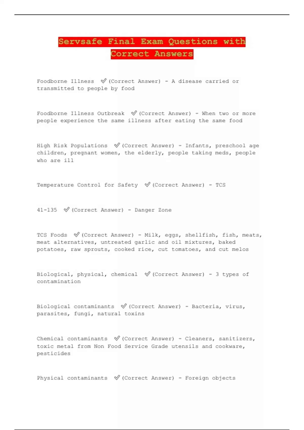 Servsafe Final Exam Questions with Correct Answers Foodborne Illness (Correct Answer) - A disease carried or transmitted to people by food Foodborne Illness Outbreak (Correct Answer) - When two or more people experience the same illness after eating the same food High Risk Populations (Correct Answer) - Infants, preschool age children, pregnant women, the elderly, people taking meds, people who are ill Temperature Control for Safety (Correct Answer) - TCS 41-135 (Correct Answer) - Danger Zone TCS Foods (Correct Answer) - Milk, eggs, shellfish, fish, meats, meat alternatives, untreated garlic and oil mixtures, baked potatoes, raw sprouts, cooked rice, cut tomatoes, and cut melos Biological, physical, chemical (Correct Answer) - 3 types of contamination Biological contaminants (Correct Answer) - Bacteria, virus, parasites, fungi, natural toxins Chemical contaminants (Correct Answer) - Cleaners, sanitizers, toxic metal from Non Food Service Grade utensils and cookware, pesticides Physical contaminants (Correct Answer) - Foreign objects