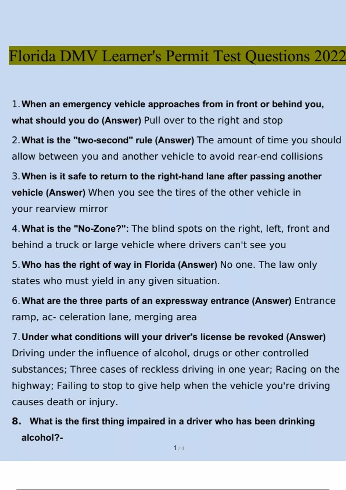 Florida DMV Learner's Permit Test. Questions and Answers 2022/2023 Verified Answers