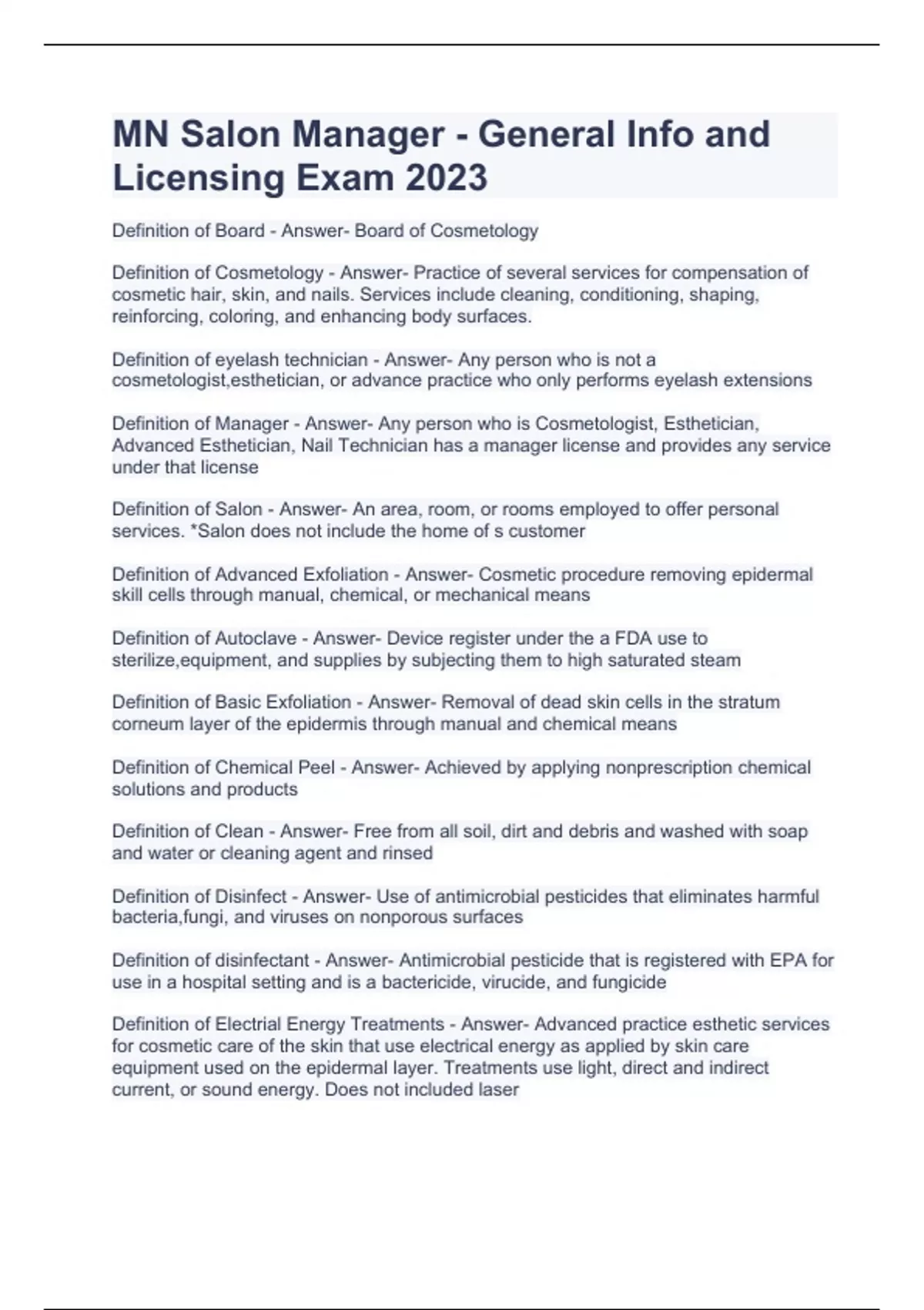Definition of Board - Answer- Board of Cosmetology Definition of Cosmetology - Answer- Practice of several services for compensation of cosmetic hair, skin, and nails. Services include cleaning, conditioning, shaping, reinforcing, coloring, and enhancing body surfaces. Definition of eyelash technician - Answer- Any person who is not a cosmetologist,esthetician, or advance practice who only performs eyelash extensions Definition of Manager - Answer- Any person who is Cosmetologist, Esthetician, Advanced Esthetician, Nail Technician has a manager license and provides any service under that license Definition of Salon - Answer- An area, room, or rooms employed to offer personal services. *Salon does not include the home of s customer Definition of Advanced Exfoliation - Answer- Cosmetic procedure removing epidermal skill cells through manual, chemical, or mechanical means Definition of Autoclave - Answer- Device register under the a FDA use to sterilize,equipment, and supplies by subjecting them to high saturated steam Definition of Basic Exfoliation - Answer- Removal of dead skin cells in the stratum corneum layer of the epidermis through manual and chemical means Definition of Chemical Peel - Answer- Achieved by applying nonprescription chemical solutions and products Definition of Clean - Answer- Free from all soil, dirt and debris and washed with soap and water or cleaning agent and rinsed Definition of Disinfect - Answer- Use of antimicrobial pesticides that eliminates harmful bacteria,fungi, and viruses on nonporous surfaces Definition of disinfectant - Answer- Antimicrobial pesticide that is registered with EPA for use in a hospital setting and is a bactericide, virucide, and fungicide Definition of Electrial Energy Treatments - Answer- Advanced practice esthetic services for cosmetic care of the skin that use electrical energy as applied by skin care equipment used on the epidermal layer. Treatments use light, direct and indirect current, or sound energy. Does not included laser Definition of Lymphatic Drainage - Answer- Using light pressure applied by manual or other means to the skin using specific lymphatic manipulations to promote drainage of fluid through tissue Definition of Microdermabrasion - Answer- Cosmetic procedure using mechanical or manual means if light abrasion in epidermal layer License Renewal - Answer- -Expires last day of birth month of the year and individual is responsible for apply without notice from board. -Continuing Education: ~ 8 hours total ~ 4 CORE CE (one hr of laws n rules, 3 health safety n sanitation) ~4 hrs of professional practice CE (product chemistry and chemical interaction, proper use of machines and instruments, business Managament ethics human relations, relevant techniques) Auditing - Answer- Must provide proof of CE within 30 days of request. Maintaining a salon license - Answer- 1) Must not employ unlicensed person to preform any regulated services 2) Must comply with the provisions of MN Statutes and Rules 3) Must maintain any required worker's compensation insurance and professional liability coverage 4) Regulated services must be provided in a place of said licensed salon or school 5) Salon has 60 days after move to change address. After 61 days salon must cease operations until updated license 6) If change if name; salon must resubmit form, provide legal document if name change and other documents to State. 7) Provide new insurance and liability certificate 8) Any change of ownership must be changed and reapplied to the Board after 60 days Salons in Private Residence - Answer- 1) Must meet all requirements 2) Space must not be used for any residential purposes at any times 3) Must be completely separated from residential areas. 4) All cosmetology services must be provided in space Salon Physical Requirements - Answer- 1) Display of salon name 2) Space must meet all zones and coding 3) Lights and walls must be dust free and in good repair 4) Floors must be clean and free all debris and in great condition Nursing home Limits - Answer- if staff of said nursing home only washes, setting, trimming hair, basic nail treatment. Or if licensee with homebound service permits provides services only for residents