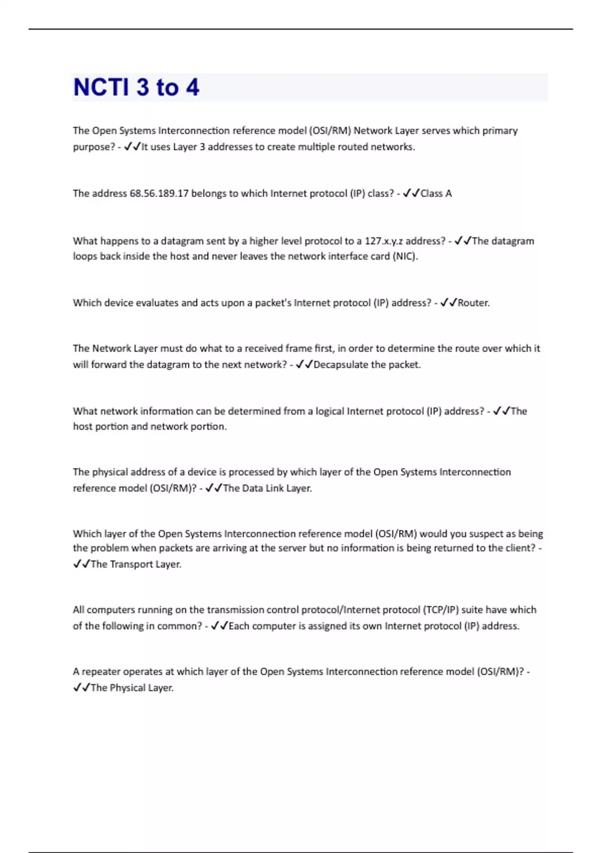 The Open Systems Interconnection reference model (OSI/RM) Network Layer serves which primary purpose? - It uses Layer 3 addresses to create multiple routed networks. The address 68.56.189.17 belongs to which Internet protocol (IP) class? - Class A What happens to a datagram sent by a higher level protocol to a 127.x.y.z address? - The datagram loops back inside the host and never leaves the network interface card (NIC). Which device evaluates and acts upon a packet's Internet protocol (IP) address? - Router. The Network Layer must do what to a received frame first, in order to determine the route over which it will forward the datagram to the next network? - Decapsulate the packet. What network information can be determined from a logical Internet protocol (IP) address? - The host portion and network portion. The physical address of a device is processed by which layer of the Open Systems Interconnection reference model (OSI/RM)? - The Data Link Layer. Which layer of the Open Systems Interconnection reference model (OSI/RM) would you suspect as being the problem when packets are arriving at the server but no information is being returned to the client? - The Transport Layer. All computers running on the transmission control protocol/Internet protocol (TCP/IP) suite have which of the following in common? - Each computer is assigned its own Internet protocol (IP) address. A repeater operates at which layer of the Open Systems Interconnection reference model (OSI/RM)? - The Physical Layer.