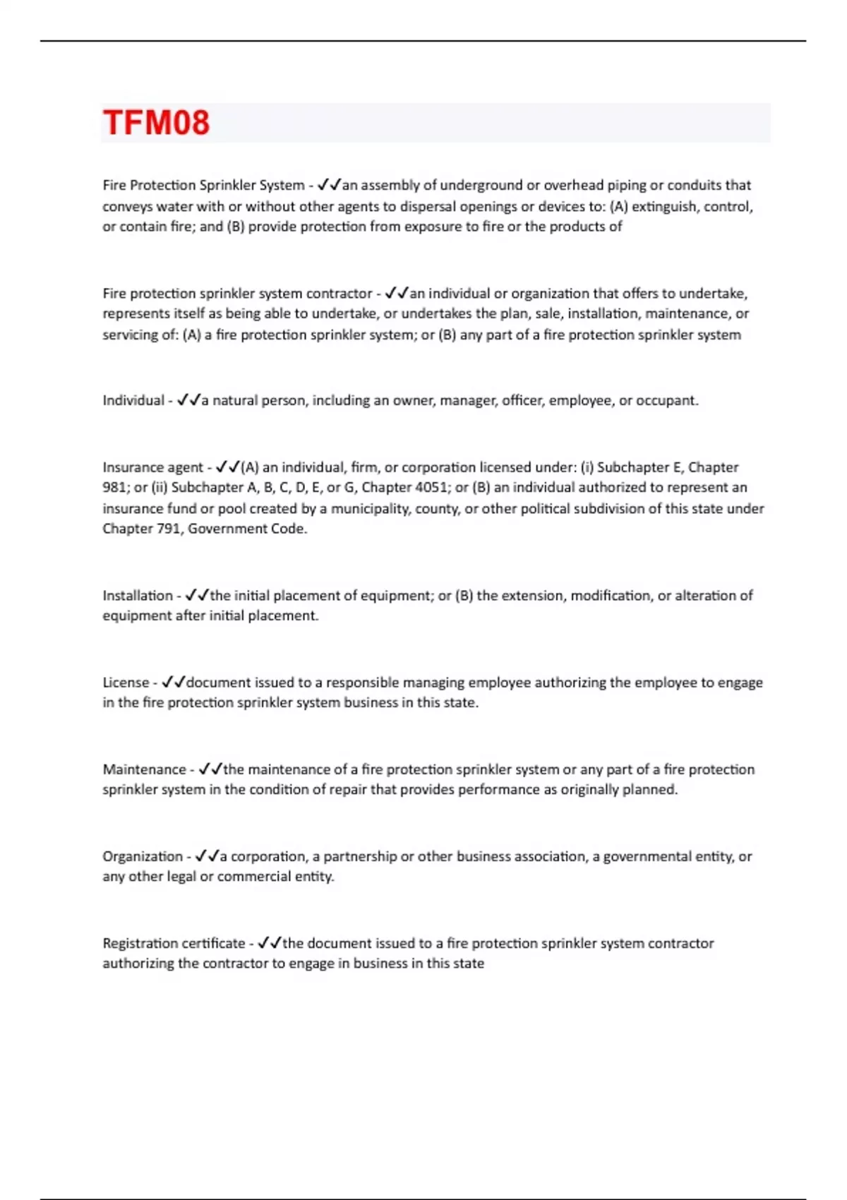 Fire Protection Sprinkler System - an assembly of underground or overhead piping or conduits that conveys water with or without other agents to dispersal openings or devices to: (A) extinguish, control, or contain fire; and (B) provide protection from exposure to fire or the products of Fire protection sprinkler system contractor - an individual or organization that offers to undertake, represents itself as being able to undertake, or undertakes the plan, sale, installation, maintenance, or servicing of: (A) a fire protection sprinkler system; or (B) any part of a fire protection sprinkler system Individual - a natural person, including an owner, manager, officer, employee, or occupant. Insurance agent - (A) an individual, firm, or corporation licensed under: (i) Subchapter E, Chapter 981; or (ii) Subchapter A, B, C, D, E, or G, Chapter 4051; or (B) an individual authorized to represent an insurance fund or pool created by a municipality, county, or other political subdivision of this state under Chapter 791, Government Code. Installation - the initial placement of equipment; or (B) the extension, modification, or alteration of equipment after initial placement. License - document issued to a responsible managing employee authorizing the employee to engage in the fire protection sprinkler system business in this state. Maintenance - the maintenance of a fire protection sprinkler system or any part of a fire protection sprinkler system in the condition of repair that provides performance as originally planned. Organization - a corporation, a partnership or other business association, a governmental entity, or any other legal or commercial entity. Registration certificate - the document issued to a fire protection sprinkler system contractor authorizing the contractor to engage in business in this state