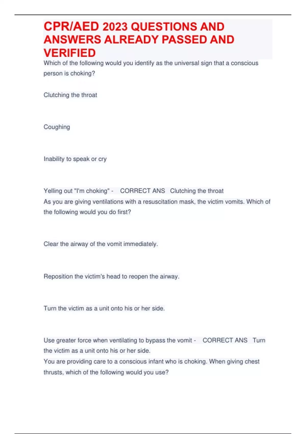 CPR/AED 2023 QUESTIONS AND ANSWERS ALREADY PASSED AND VERIFIED