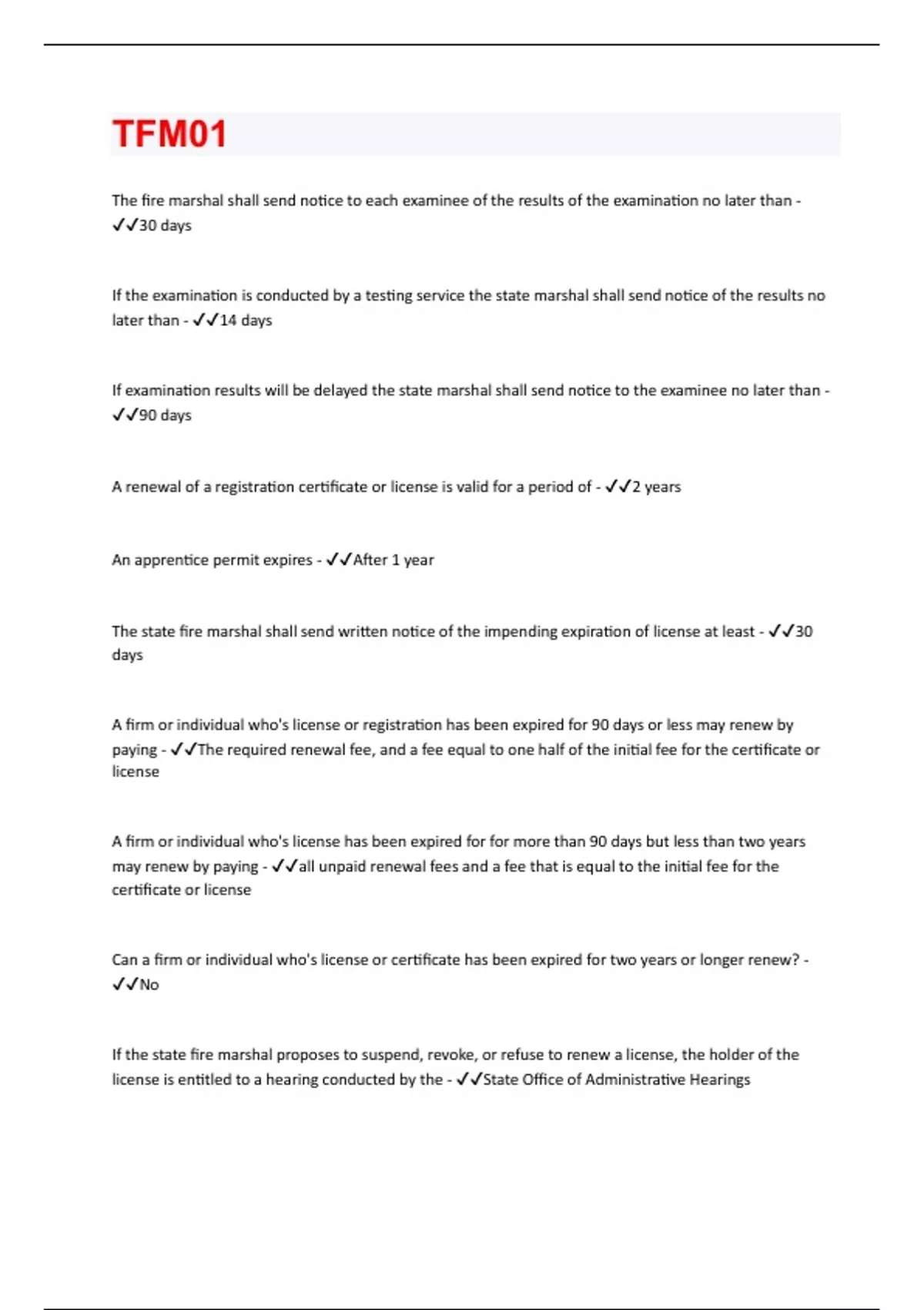 he fire marshal shall send notice to each examinee of the results of the examination no later than - 30 days If the examination is conducted by a testing service the state marshal shall send notice of the results no later than - 14 days If examination results will be delayed the state marshal shall send notice to the examinee no later than - 90 days A renewal of a registration certificate or license is valid for a period of - 2 years An apprentice permit expires - After 1 year The state fire marshal shall send written notice of the impending expiration of license at least - 30 days A firm or individual who's license or registration has been expired for 90 days or less may renew by paying - The required renewal fee, and a fee equal to one half of the initial fee for the certificate or license A firm or individual who's license has been expired for for more than 90 days but less than two years may renew by paying - all unpaid renewal fees and a fee that is equal to the initial fee for the certificate or license Can a firm or individual who's license or certificate has been expired for two years or longer renew? - No If the state fire marshal proposes to suspend, revoke, or refuse to renew a license, the holder of the license is entitled to a hearing conducted by the - State Office of Administrative Hearings