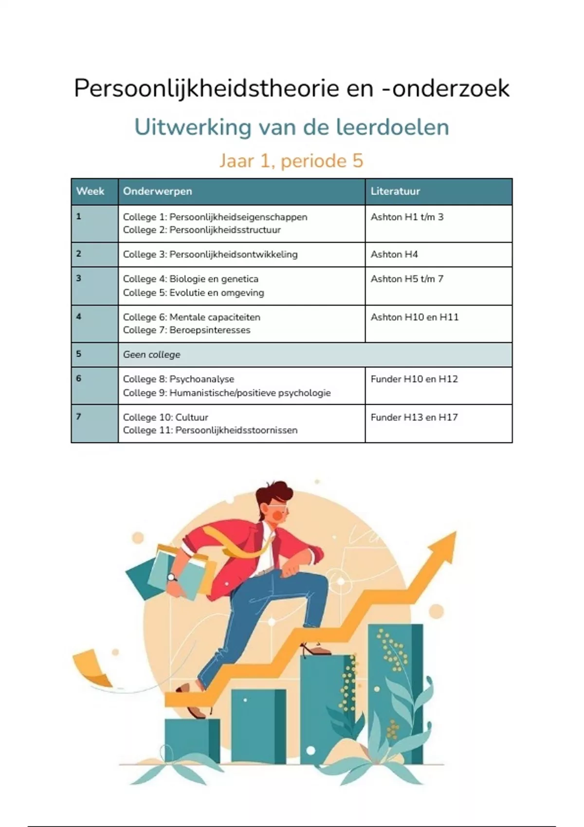 Uitgebreide samenvatting van de leerdoelen van het vak 'Persoonlijkheidstheorie en onderzoek'.